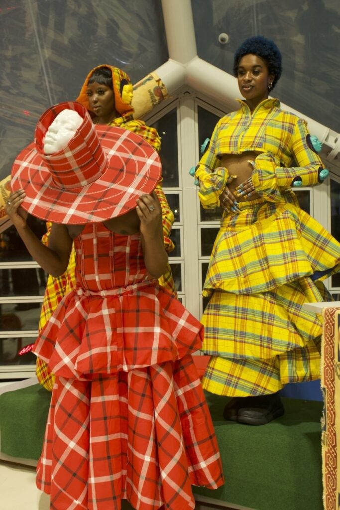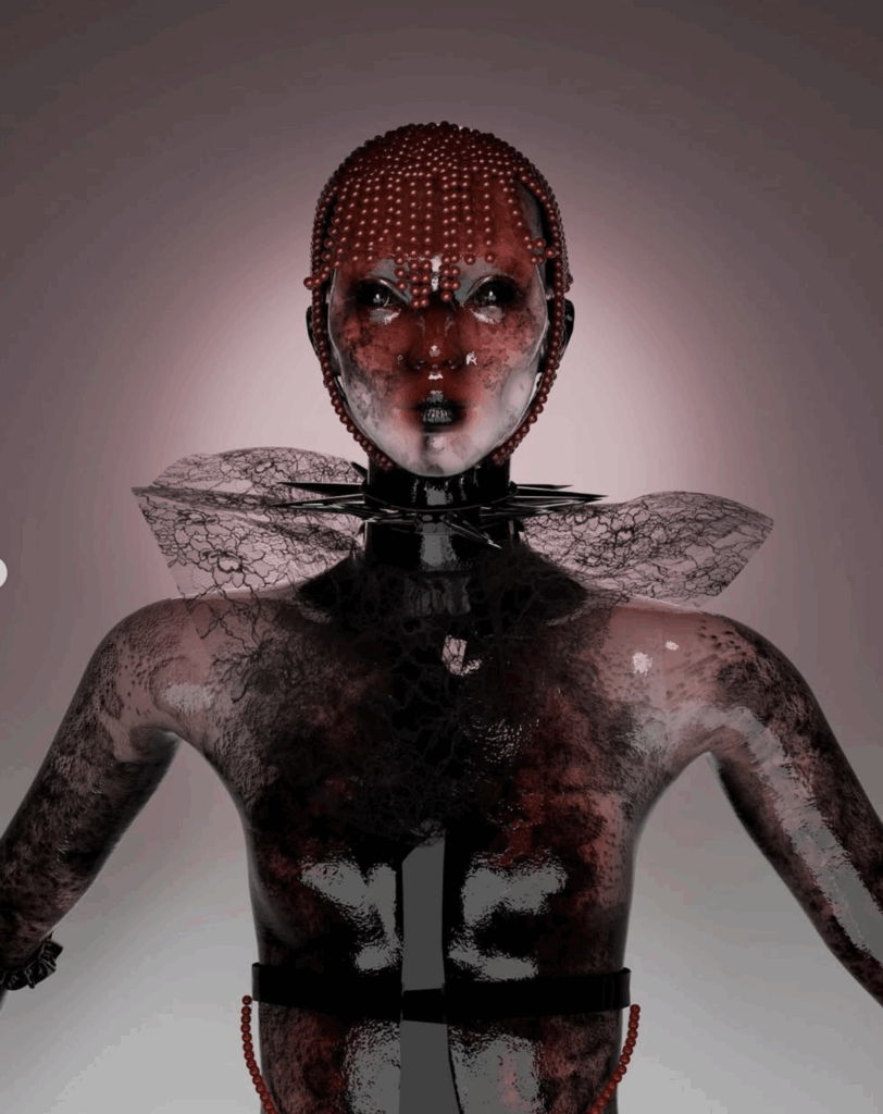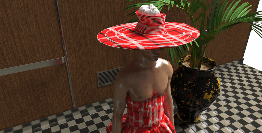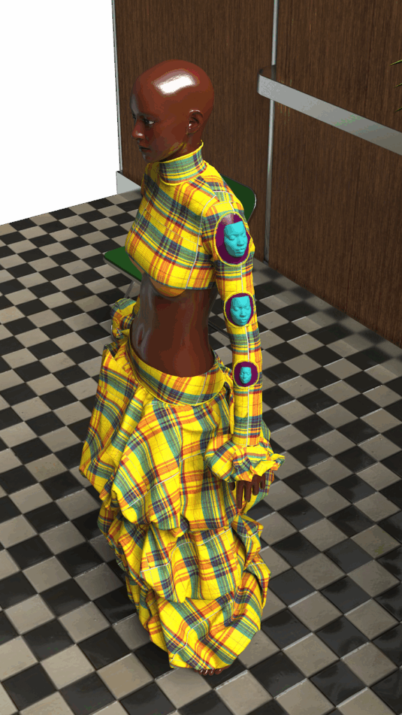Het ontbreken van zwarte representatie in de mainstream modewereld beantwoordt Burger met een krachtig gebaar: ze plaatst haar eigen gezicht letterlijk in het centrum van haar werk. Met een 3D-scanner digitaliseerde ze haar gelaat, die ze vervolgens in felgekleurd kunststof printte. Deze gezichten keren terug in haar kleding– bijvoorbeeld als kroon van een plechtige hoed. Wanneer de modellen hun blik neerslaan, verschijnt het gezicht van Burger zelf. Op de plekken waar normaal een merklogo zou staan, prijkt nu haar strijdbare blik. Zo eigent ze zich de ruimte toe en maakt ze zichzelf zichtbaar in een modewereld die het zwarte lichaam lange tijd onzichtbaar maakte.