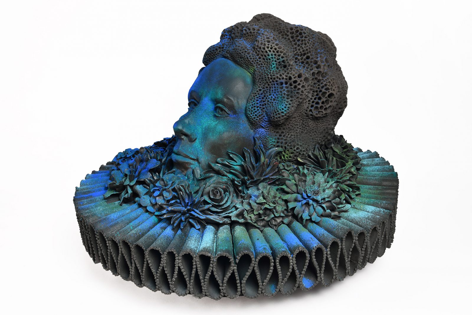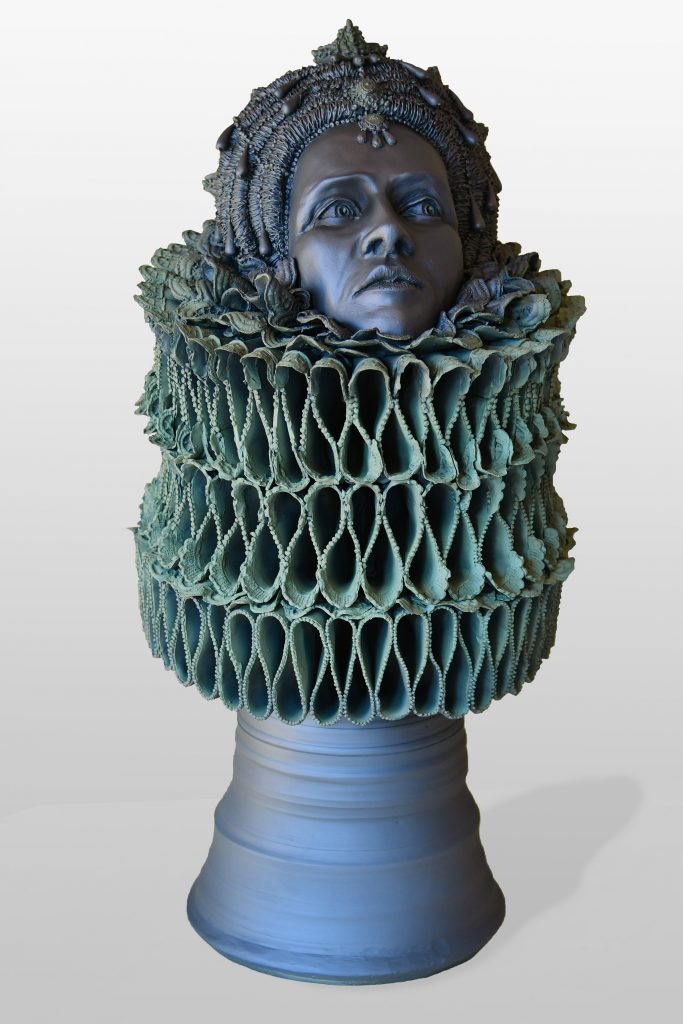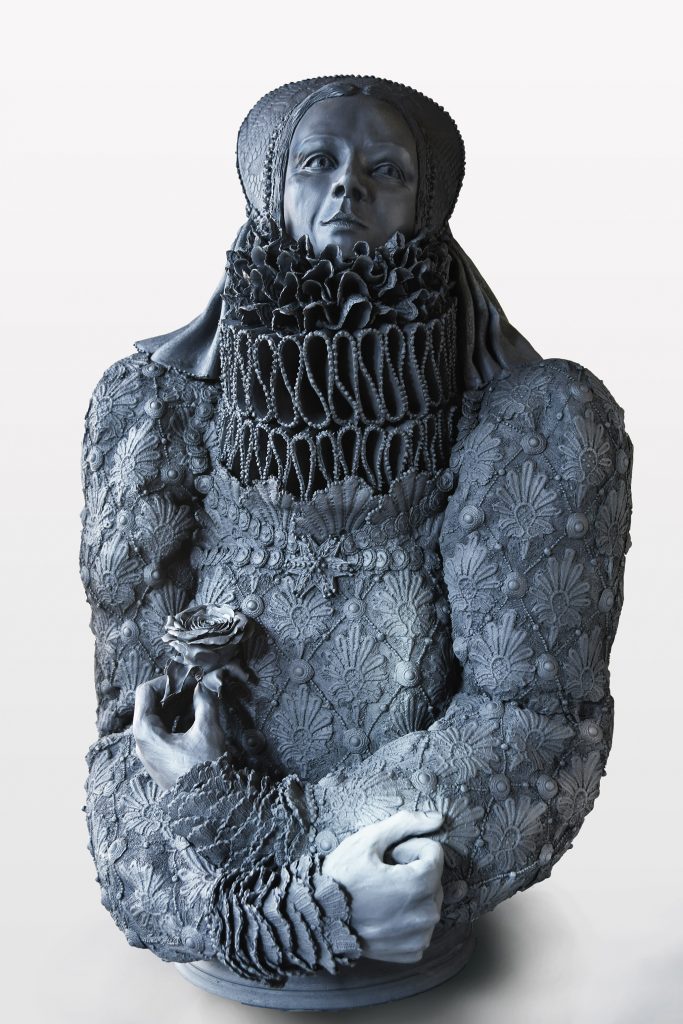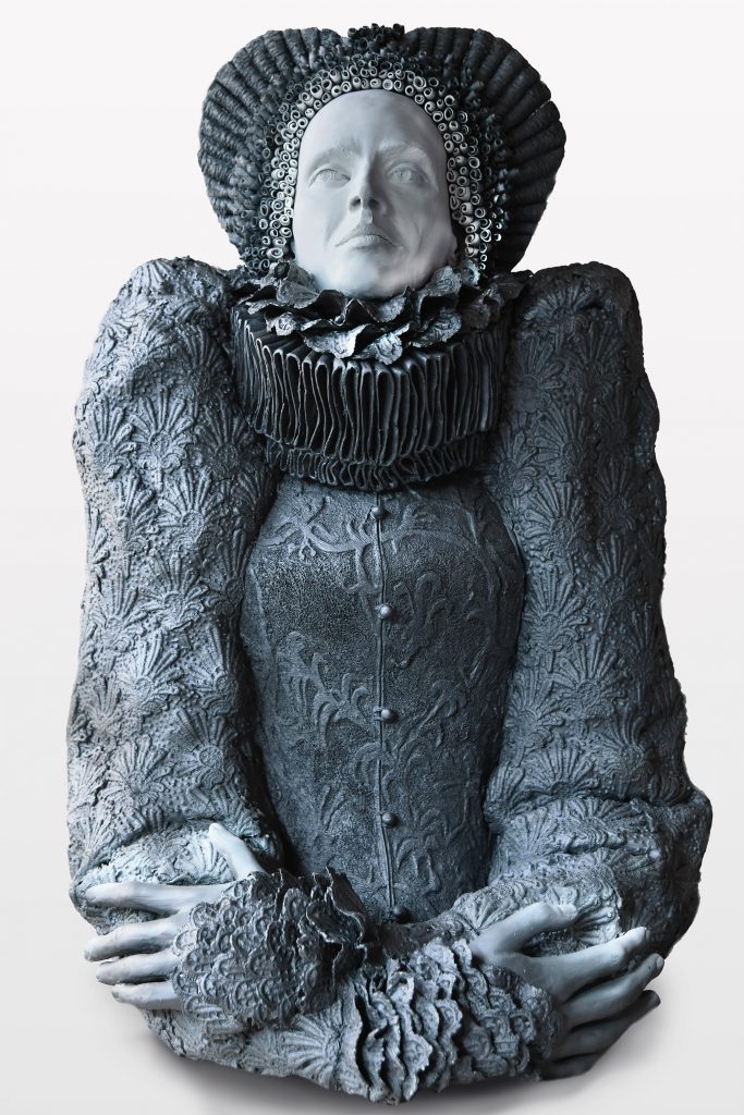 Nog persoonlijker en noodzakelijker zijn haar beelden van vrouwen in uitbundige kostuums die als titel Frozen Queen dragen. Onder meer de historische romans van Hilary Mantel zijn daarvoor een inspiratiebron. In hun gedetailleerde gewaden met verstikkende kanten kragen die ze soms verdubbelt, laat Eveline Kieskamp zien hoe het is om als vrouw letterlijk in een keurslijf gevangen te zitten. De pracht en praal waarmee deze vrouwen zijn uitgedost, torsen ze als een last waar ze onderuit proberen te komen.