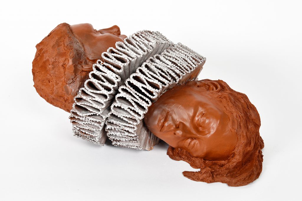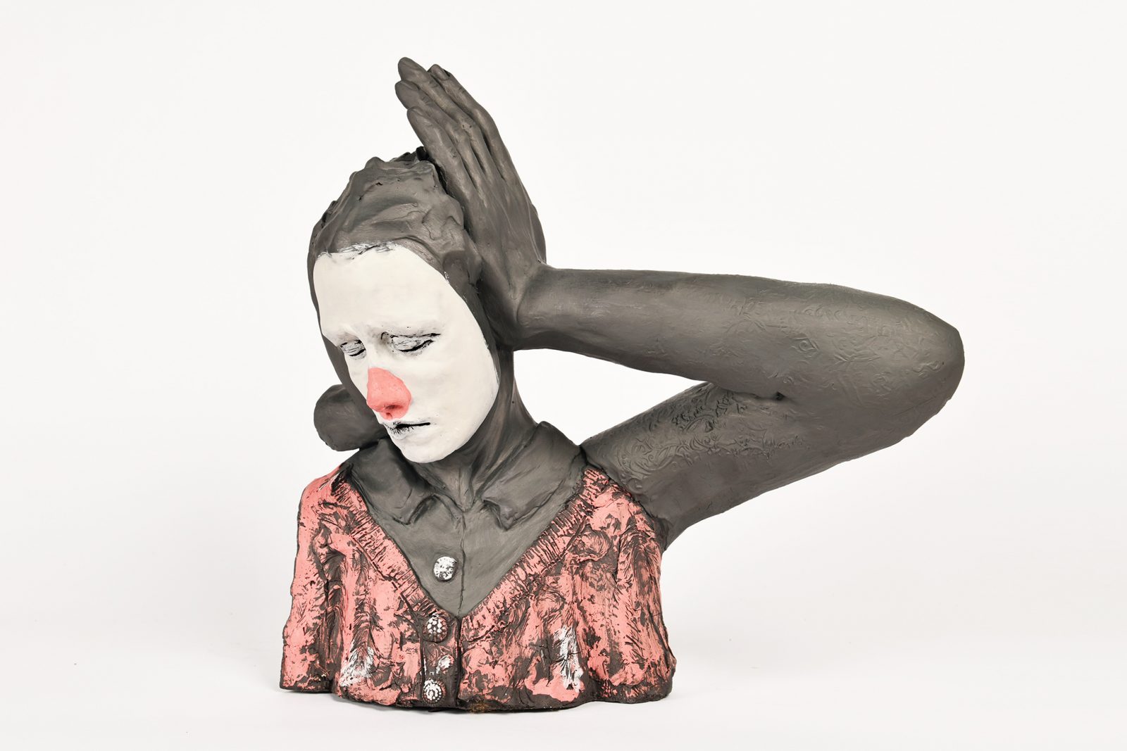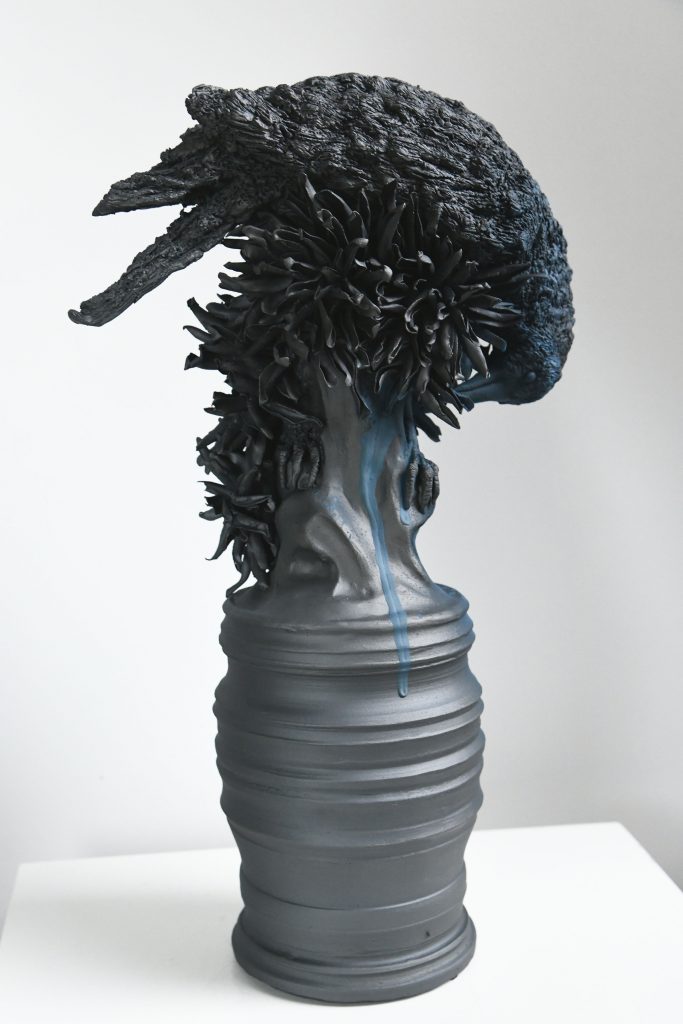 ‘Na de geboorte van mijn tweede kind begon ik pas in 2010 echt mijn ruimtelijke werk te ontwikkelen waaraan ik tijdens de opleiding vrije kunst was begonnen. Daar werkte ik vooral met textiel, hout en epoxy, maar ik ging toen na zes lessen keramische sculpturen maken van hoog gestookt steengoed. Dat is een moeilijke techniek en je moet leren wat wel en niet kan. Wat gaat er goed of niet goed in de oven? Technisch bouw ik mijn beelden hol op met platen uitgerolde klei en steunplaten.’