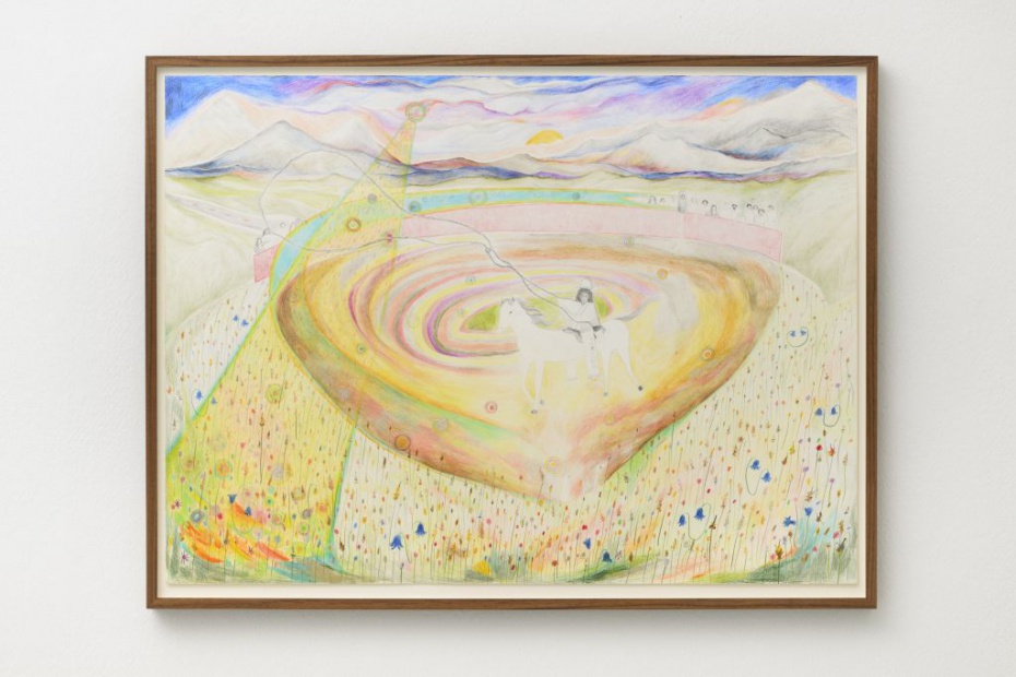 In dezelfde ruimte, naast de werken van Katayama, hangt het werk van Rory Pilgrim. Pilgrims papieren tekeningen ogen nog fragieler, vooral omdat ze hangen in een mager frame. In waterverf, met zachte lijnen, glitter en zachte kleuren, creëert Pilgrim een magische wereld waarin onderwerpen zoals ouderenzorg, de ecologische crisis, eenzaamheid en verdraagzaamheid aan bod komen. Cirkels komen veel terug: kleine cirkels van gekleurd licht waar omheen statements staan zoals ‘state cruelty’ en ‘state negligence’, in een andere tekening zie ik een ruiter die een touw met een lus in de lucht houdt en er een cirkel mee vormt, alsof die de mensen om zich heen wil vangen.