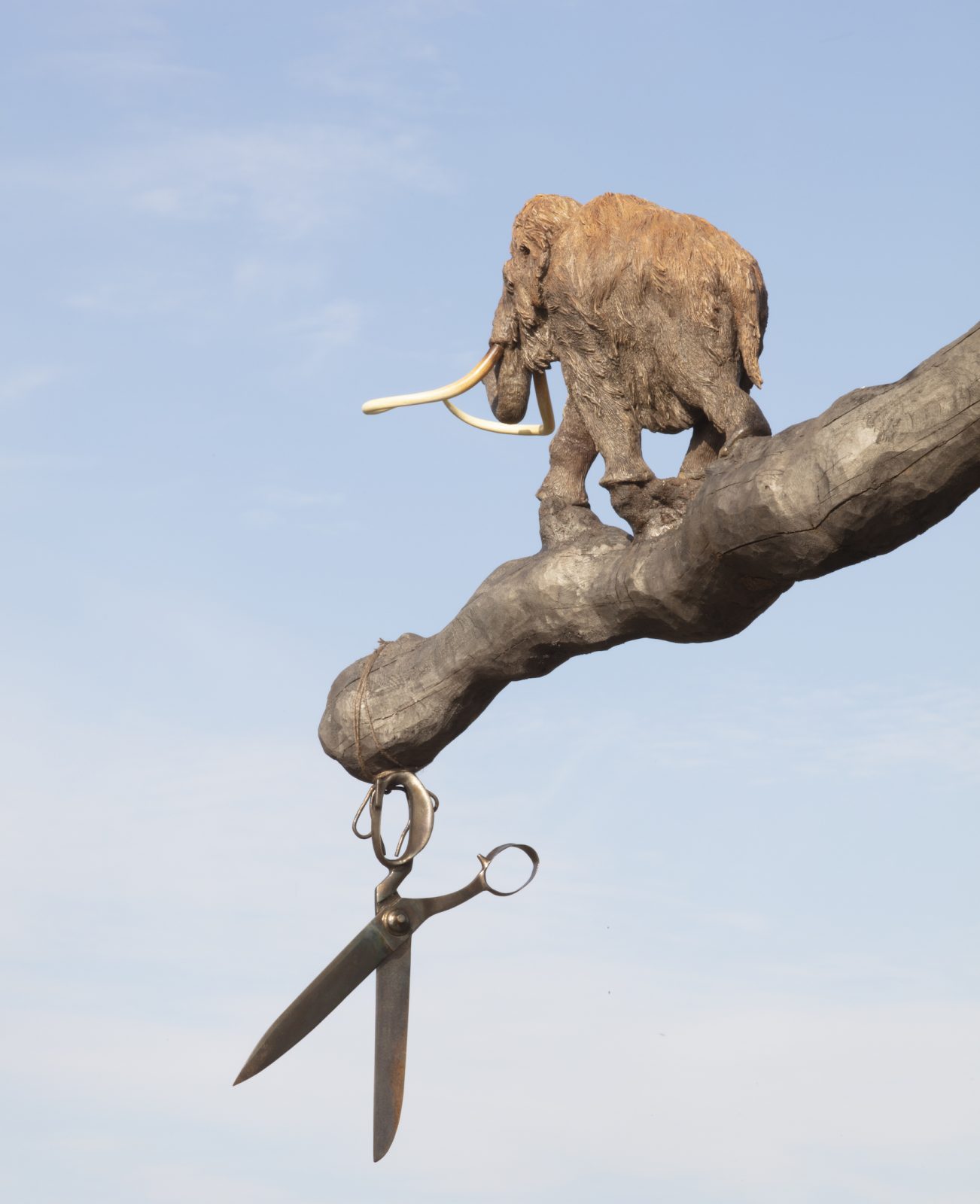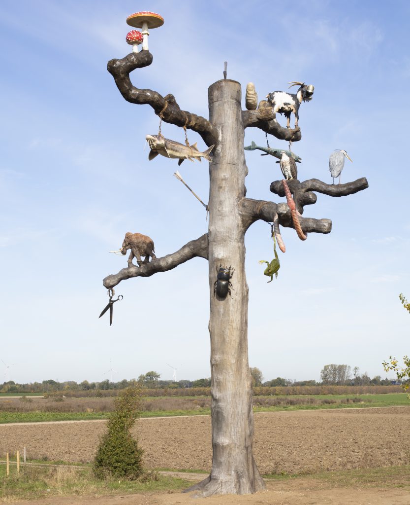 Als antropoloog weet Wim nog meer van zulke verhalen te vertellen over de Maas of andere rivieren. Het is evident dat hij zich al jaren in dit onderwerp verdiept. Als kunsthistoricus kan ik het niet laten mijn blik weer op het kunstwerk te werpen. Naast de dieren beginnen mij andere elementen op te vallen: een bijl die boven in de boomstam is blijven steken, een schaar die aan een van de takken hangt.