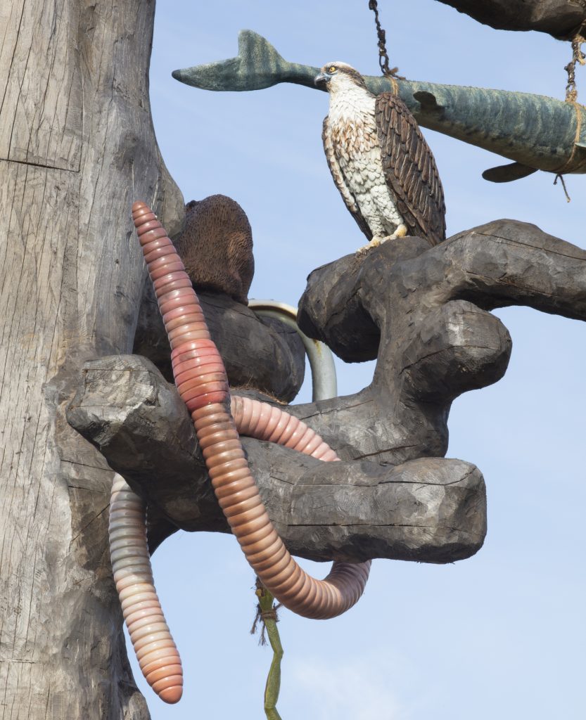 We werpen onze blikken omhoog, de boom in. We proberen de verschillende dieren uit deze levensboom te herkennen. Om een van de takken krioelt een lange, grote regenworm. Een ander voorbeeld is een bok met een kelk in de bek, die verwijst naar eeuwenoude volksverhalen over de bokkenrijders. Wim herkent de Mosasaurus, een uitgestorven roofdier waarvan een skelet in de omgeving van Maastricht is gevonden. Het lijken allemaal dieren te zijn die in de Maasvallei leven, die hier lang geleden geleefd hebben, of die in bepaalde mythes voorkomen die in verband zijn gebracht met de rivier.