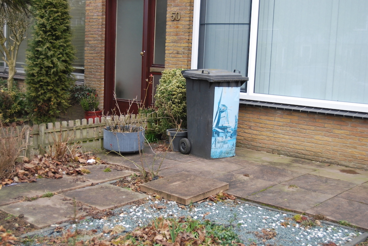 In Vleuten heeft de straat een consistent blauw palet, wat je onder andere terugziet in de lantaarnpalen en in het paneelwerk van de woningen. Bij de tuinaccessoires in deze straat lijkt de kleur blauw oververtegenwoordigd. Zouden de aanwonenden onbewust met de kleurkeuze van de architect in de pas zijn gaan lopen? Als de panelen op de huizen allemaal geel worden geschilderd, hoe lang duurt het dan voordat er in de voor de huizen plantenbakken en tuinstoelen opduiken in complementaire geeltinten?