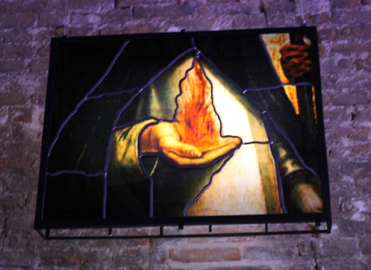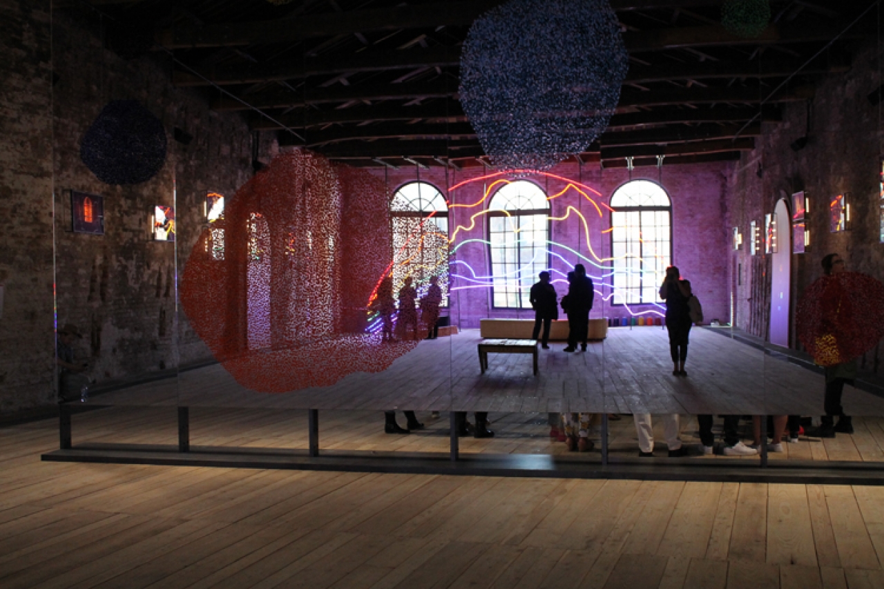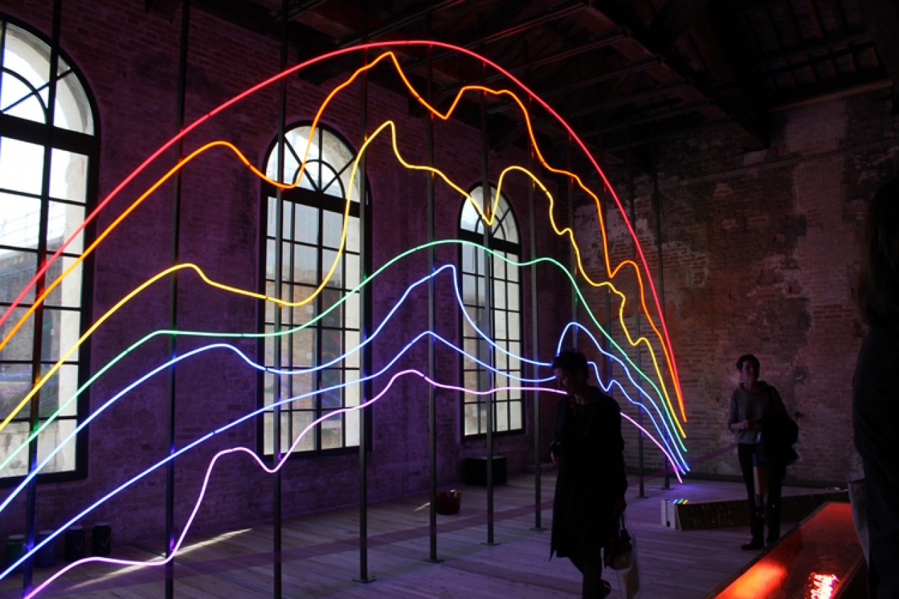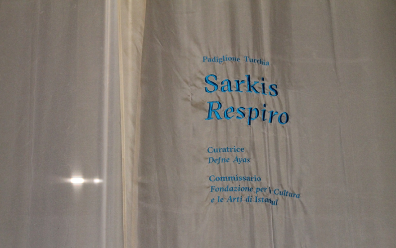 Turkije heeft zijn tentoonstelling Respiro in Arsenale, waar Sarkis de ruimte heeft mogen vullen. Door een wit dun gordijn betreed je een ruige ruimte met een hoog plafond, de klassieke muziek komt je vredig tegemoet. Zesendertig verlichte foto’s zijn te zien, bewerkt als een glas in lood raam. Twee handen dragen de vlammen, een engel gluurt naar de Hagia Sophia. Op de andere afbeeldingen zien je oorlog en pijn voorbij komen maar ook autobiografische elementen van Sarkis. Hij bouwt een kerk in het paviljoen. Aan weerszijde van de ruimte zijn twee schitterende neon regenbogen en in het midden van de ruimte staan twee enorme spiegels tegen elkaar. De spiegels zijn bedrukt met gekleurde vingerafdrukken van zeven kinderen. Jacopo Baboni-Schilingi componeerde de muziek uit de speakers op basis van de zeven kleuren van de regenboog. Respiro betekent adem in het Italiaans, laat de kleuren van de regenboog je nieuwe energie geven.