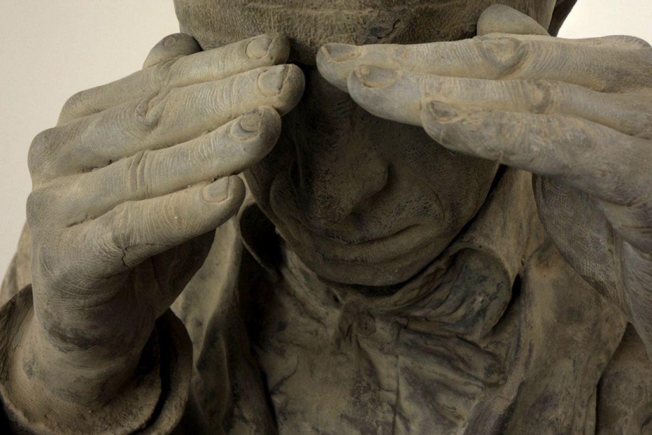 Ook de realistische sculptuur van Diego Tonus is een bemiddelaar tussen de reële wereld en het virtuele domein. Het beeld is in zekere het topje van de ijsberg van een uiterst gelaagd project. Het is gemaakt van aluminiumbeton en is een afgietsel van een handelaar in bitcoins. Is dat waarom hij zijn gezicht afschermt met zijn handen? In het holle beeld bevindt zich een metalen plaquette met de code die toegang biedt tot een aantal bitcoin-munten. De waarde van deze munten fluctueren (net als die van kunst). Het beeld en de bitcoin-plaquette zijn door Tonus vastgelegd bij het Benelux merkenbureau. De sculptuur in de studio van Thomas is een onderdeel in een complex spel met waarde(n)vorming, betekenis en auteurschap als inzet.