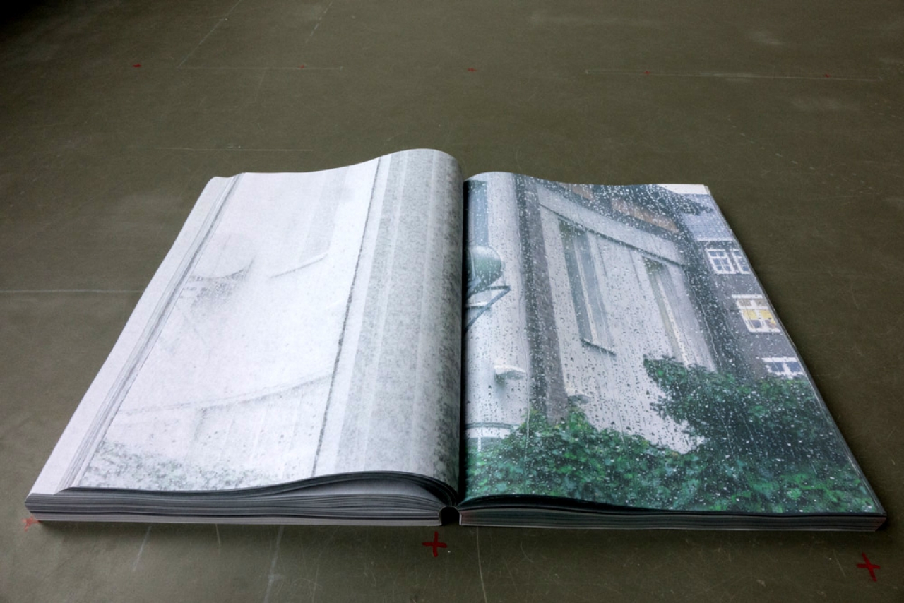 De vier wanden van Glockners studio zijn tot zo hoog als ze met haar hand kan reiken met rode draadjes in een grid van A3tjes verdeeld. Bij binnenkomst zie je dat niet meteen. Op de vloer markeren rode kruisjes het raster. Elk element van het grid is systematisch gefotografeerd. De foto’s zijn geprint in een lijvig boek dat opengeslagen midden op de vloer ligt. Hierin kun je de gedeconstrueerde ruimte als het waren ‘lezen’. Het gekozen papier zorgt dat de inkt door de pagina’s heen bloedt, waardoor je de afbeelding op de achterzijde als een verweerd fresco door het papier ziet schemeren. De fotobeelden krijgen hierdoor een tactiele kwaliteit.