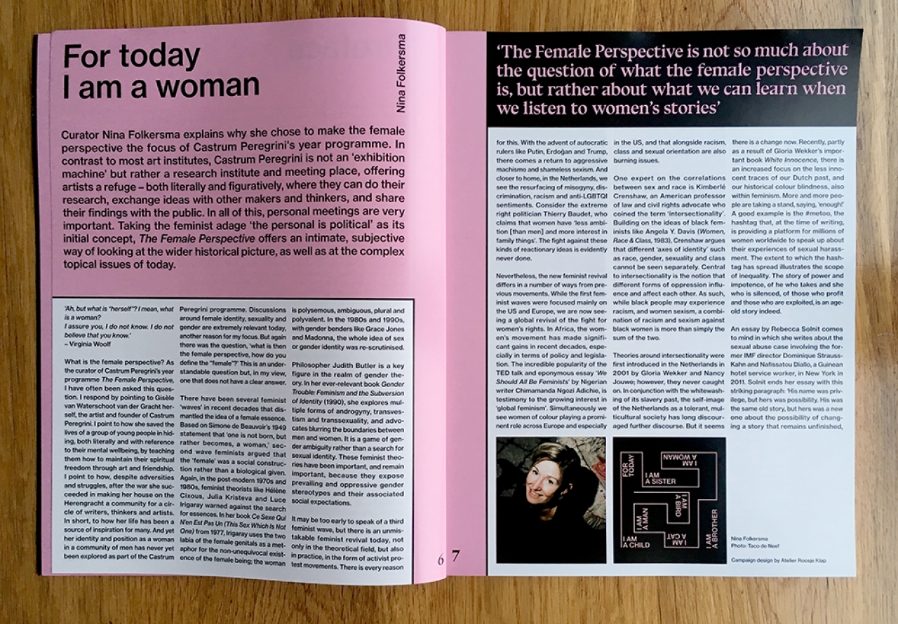Castrum Peregrini heeft het afgelopen jaar samen met Nina Folkersma diverse programma’s georganiseerd rondom deze vraag in het voormalige onderduikadres. Ze nodigden kunstenaars naar aanleiding van dit thema uit voor lezingen, performances, onderzoeken en tentoonstellingen. Niet alleen past deze thematiek prachtig op de plek waar meer dan 70 jaar geleden Gisèle van Waterschoot van der Gracht haar huis ter beschikking stelde aan (mannelijke) kunstenaars die moesten onderduiken waardoor zij de gehele oorlog onderdeel was van een ‘mannenwereld’, maar de vrouwelijke verhalen zijn anno 2018 ook meer van belang dan ooit. Met de opkomst van autoritaire machthebbers als Poetin, Erdogan en Trump is er sprake van een terugkeer van agressief machismo en schaamteloos seksisme. Het is dan ook geen toeval dat er momenteel een zekere opleving van het feminisme valt te bespeuren, niet alleen op theoretisch gebied, maar vooral ook in de praktijk, in de vorm van activistische protestbewegingen. Daarbij moet direct vermeld worden dat dit tegengeluid ook zeker van mannen afkomstig kan zijn (kunstenaar Pieter Paul Pothoven schreef bijvoorbeeld een indringende briefwisseling voor de publicatie).