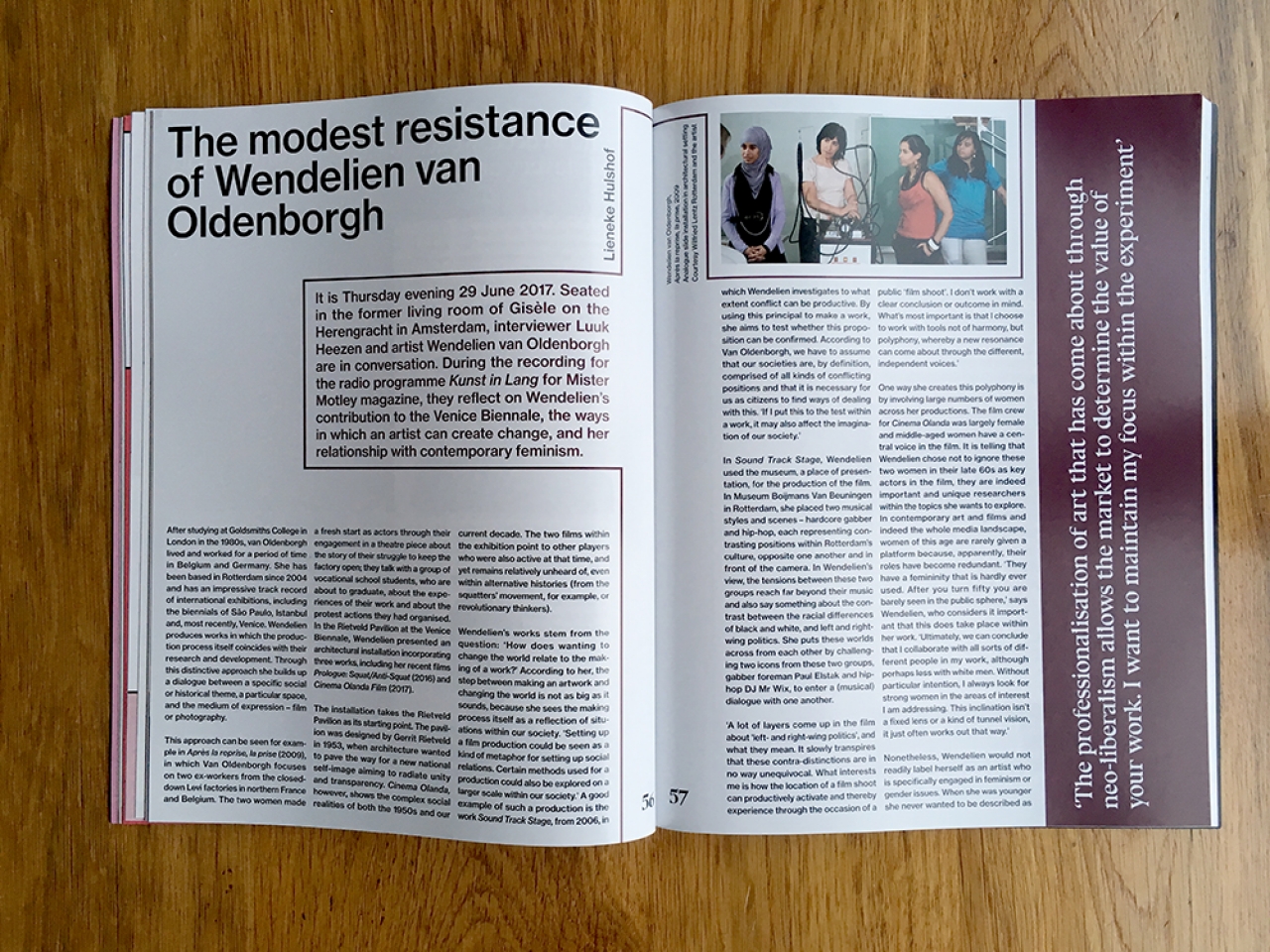 -Katerina Gregos spreekt met Nat Muller over de vrijheid van de autonome kunst ten opzichte van politieke correctheid en ikzelf publiceer een interview met Wendelien van Oldenborgh over haar relatie met het vrouwelijke perspectief en hoe haar manier van denken over feminisme met de jaren is veranderd.