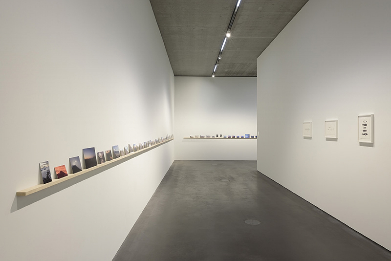 In het tweede deel van het kunstwerk Ascent, dat zich in de rondgang om de videozaal heen bevindt, staan de beelden werkelijk stil. Aan de muur in deze lange gang is een schap aangebracht. Daarop staan naast elkaar in een wandlange rij zo’n 150 afdrukken van Fuji-foto’s als ansichten op een plankje.