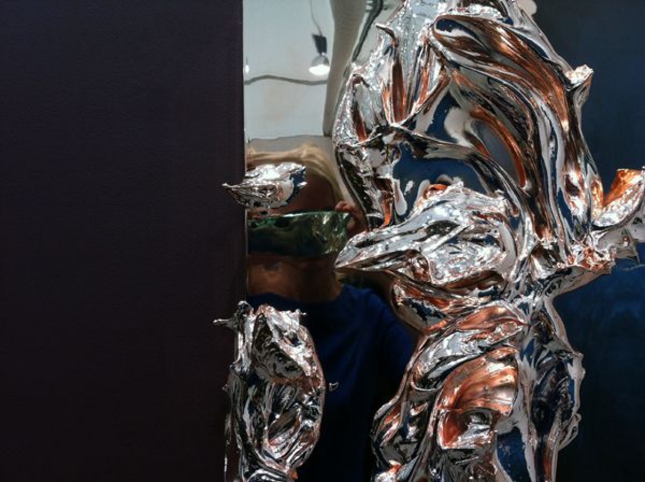 Wetende dat ik niet ‘dear‘ ben kijk ik toch om en zie een blonde Russische vrouw van bijna twee meter, met kasjmir coltrui en los golvend blond haar. Aan haar hand trekt ze een zuidelijk uitziende man met zich mee, strak in pak, zwart haar in zijscheiding en zongebruind, ook hij lacht zijn hagelwitte tanden bloot. De vrouw ziet me niet staan. Haar ‘Dear’ is een norse, kale Rus. Weer roept ze hem: ‘Dear, come meet my friend.’ Haar slepende Engels weergalmt tussen de schilderijen en sculpturen. ‘What was you’re name again?’ vraagt ze ditmaal zachter aan de zuidelijke man die een kop kleiner is, ‘Antony’ antwoordt deze. ‘Peter, darling, come, come meet my friend Antony.’ De kale norse Rus komt aangesjokt. Hij maakt duidelijk geen haast. ‘Peter, I want to introduce you to my good friend Anthony’. Peter schudt Antony onverschillig de hand. De lange Russische negeert dit gedrag en gaat op hetzelfde volume door over haar exotische nieuwe aanwinst, (de kunstenaar). ‘Dear, Antony is from Sicily and he is that artist we spoke about.’ Antony lijkt zijn interesse in de vrouw verloren en richt zich tot de norse Peter. ‘So, (Italiaans accent), how many pieces you said you bought here?’ De lange blonde vrouw antwoordt, alsof het haar wordt gevraagd, met ‘seven’. Ze hangt om de norse Peter heen en geeft hem een kus op zijn wang. Hallo James Bond film! Ik sta nogal dichtbij het drietal en sla het tafereel enkele minuten gade, krijg het gevoel dat ik deze conversatie eigenlijk niet zou mogen horen omdat het me privé lijkt, en loop dus maar door. Achter de muur hoor ik nog flarden… ‘No we didn’t buy work of you earlier, you weren’t famous yet, we dind’t know of your exhistance haha, O I simply love that piece! Can you tell me a bit about it. Do you want to have dinner tonight?’ De norse Peter vertelt over zijn depot op loopafstend van zijn huis. Schaterlach, handjeklap, kunst verkocht. Blije Italiaan, Russisch stel heeft een achtste aankoop.