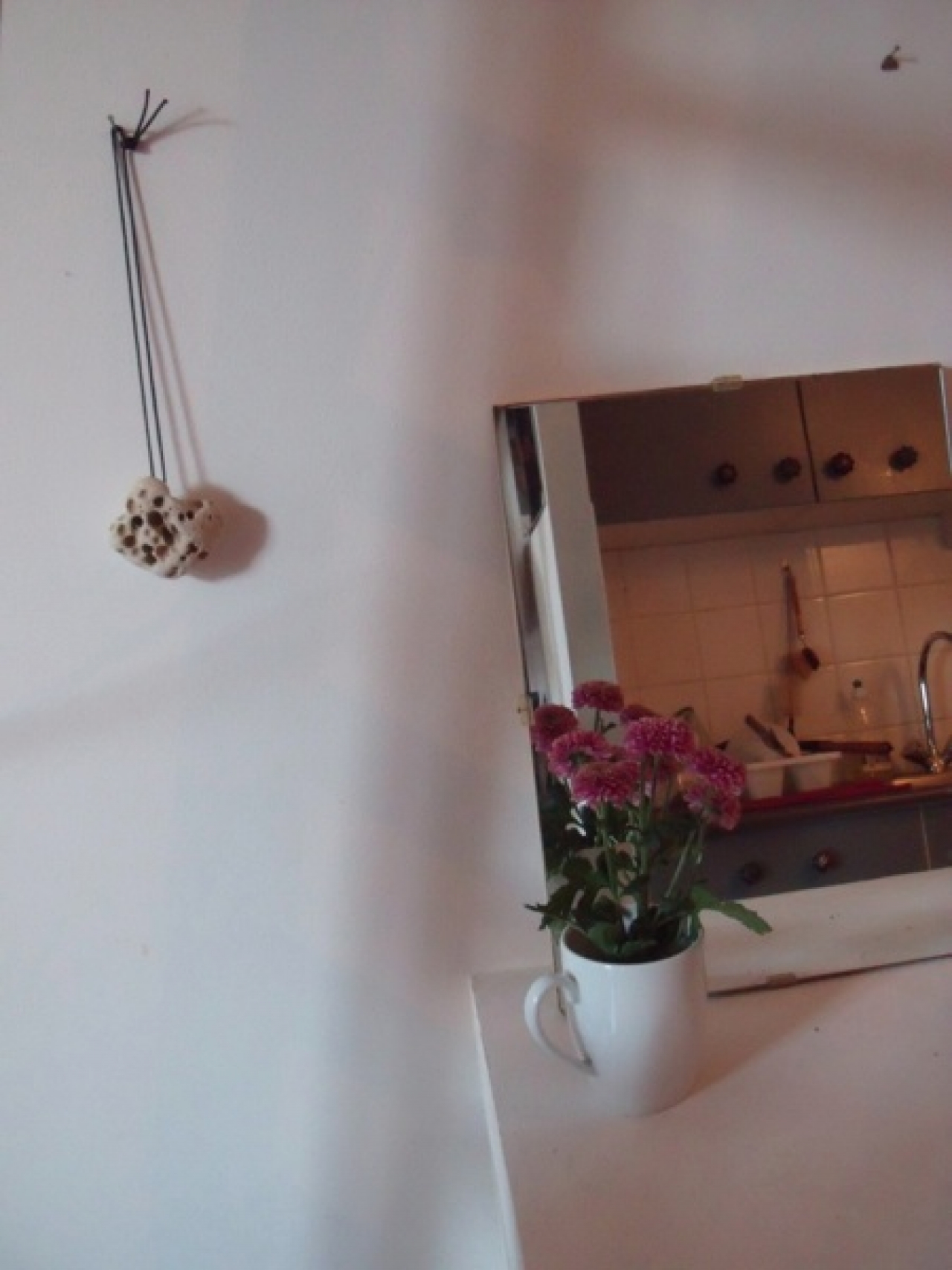 Eerder woonde Pieke dus op een boot, in het puntje van het ruim. Het zwart aan de buitenkant zag er uit als een bord om op te krijten en daar had ze dan ook onbedwingbare zin in. Ze voelde zich opgesloten in dat ruim. Op een dag heeft ze alle spullen op het dek neergezet, om eens goed uit te waaien en daarna weer naar binnen gebracht. ‘Waarom was me zelf ook niet helemaal duidelijk’, zegt ze. Het is fijn als je de dingen weer even op een andere manier ziet, in die kleine ruimte leek het heel wat maar op het dek was het niet meer dan een plukje spullen.’ Als ze in de boot was bedacht ze zich steeds hoe ver het water aan de andere kant van de wand zou staan.