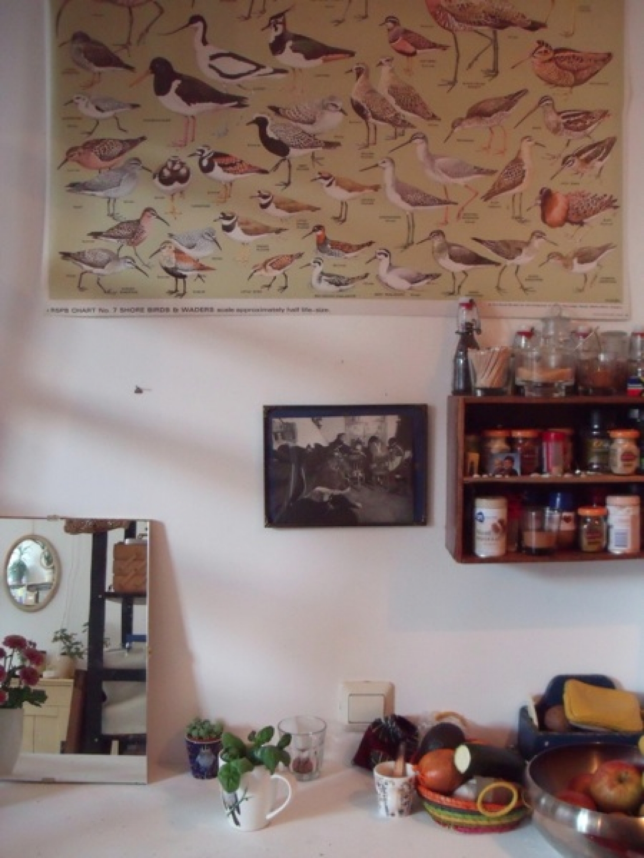 Kijk hier een vlinder, daar een hommel. De plantenpotten heb ik met acryl geverfd. Ik vind het fijn als er veel planten in een huis staan. En deze pentekeningen heb ik gemaakt toen ik in het ruim van een boot woonde, tekeningen van alles wat ik toen om me heen had. Oude foto’s van mijn oma, eigengemaakte fotoboekjes, stukjes natuur, stenen, schatten. Ook heb ik alles graag geordend maar dat lukt steeds niet zo. Al mijn tekenspullen liggen wel gezellig samen in een ladenblok. In mijn huis zijn veel goede plekken waar je iets kan opbergen zo dat je geen rommel ziet, netjes, ik haat rommelbakjes.