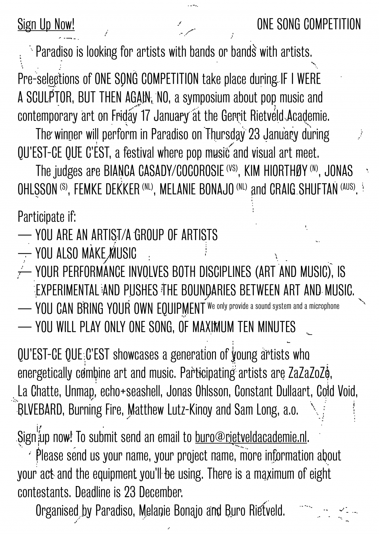 ‘If I was a sculptor, but then again, no’ laat haar licht schijnen over deze nieuwe ontwikkelingen en praat met multidisciplinaire kunstenaars en muzikanten over hun aanpak en werkwijze. Hoe verhouden zij zich tot het huidige discours, en verschilt hun werkpraktijk wezenlijk van andere kunstenaars?