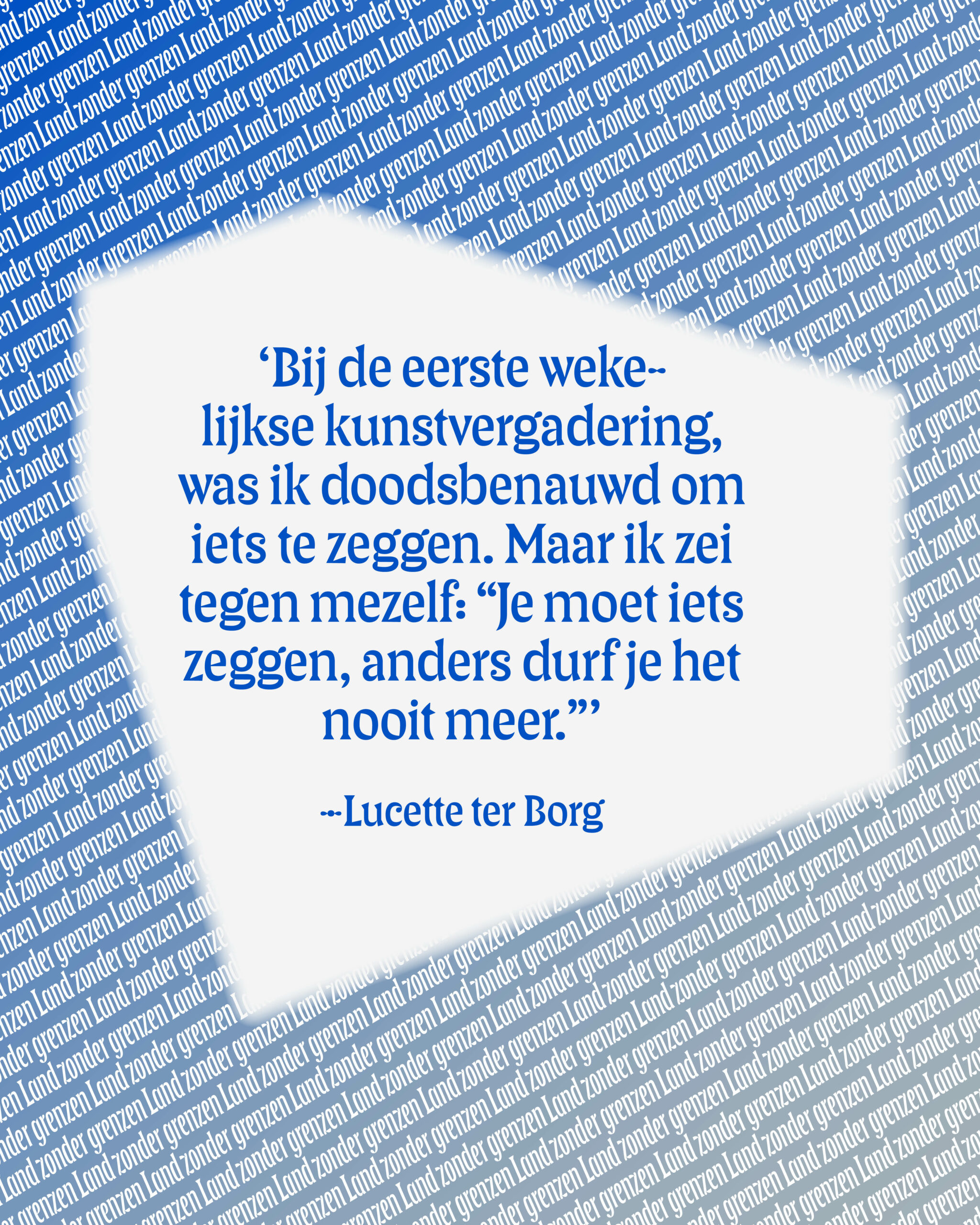Welke mate van ontoegankelijkheid ervaren mensen met een ‘lichamelijke’ beperking, mensen op leeftijd, ouders van opgroeiende kinderen en neurodivergente personen? In de reeks Land zonder grenzen onderzoeken vier ervaringsdeskundige auteurs de (on)toegankelijkheid van het kunstenveld. Voor ze haar serie aftrapt spraken Maurits de Bruijn en Laure van den Hout met Lucette ter Borg over het thema waarop zij zich zal richten: ouder worden. ‘Ik ben een paddenstoelengek en ik zie ouderdom als een vorm van mycelium, dat onder mijn huid groeit. Om de kiemkracht van dat mycelium te activeren, reis ik in mijn hoofd door de tijd. Soms sta ik in het heden, soms ben ik ineens weer terug in het verleden en lijkt het alsof ik zaadjes opraap die ik vroeger liet liggen en nu van veel betekenis zijn.’