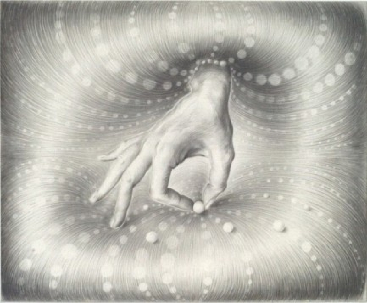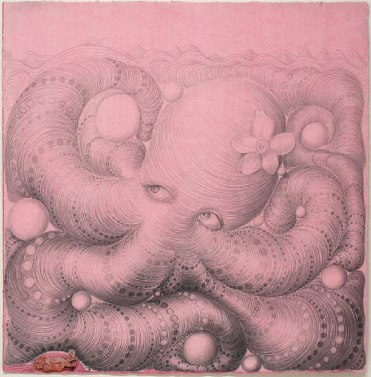 Beeldend kunstenaar Kinke Kooi vertelde me dat ze na de academie schilderijen maakte en daar best succes mee had. Desondanks moest ze zichzelf naar het atelier toe duwen, er ontbrak een noodzakelijke urgentie die ze labelde als een luiheidssyndroom. Toch kon ze zich nog herinneren hoe ze als kind zo intens tekende dat ze gewoonweg niet kon stoppen, dat ze het eten van een boterham als een irritante onderbreking ervoer. Ze besloot radicaal terug te keren naar dat plezier en tegen alle trends en stromingen in begon ze weer met tekenen als een lange sliert bewegingen, bijna zonder het potlood van het papier te halen. De onderwerpen zocht ze dicht bij huis, vrouwendingen als cellulitis, borsten, het lichaam, opsmuk, in de ‘onmogelijke’ kleuren felroze en knalpaars. Haar tekeningen knalden de muur af.