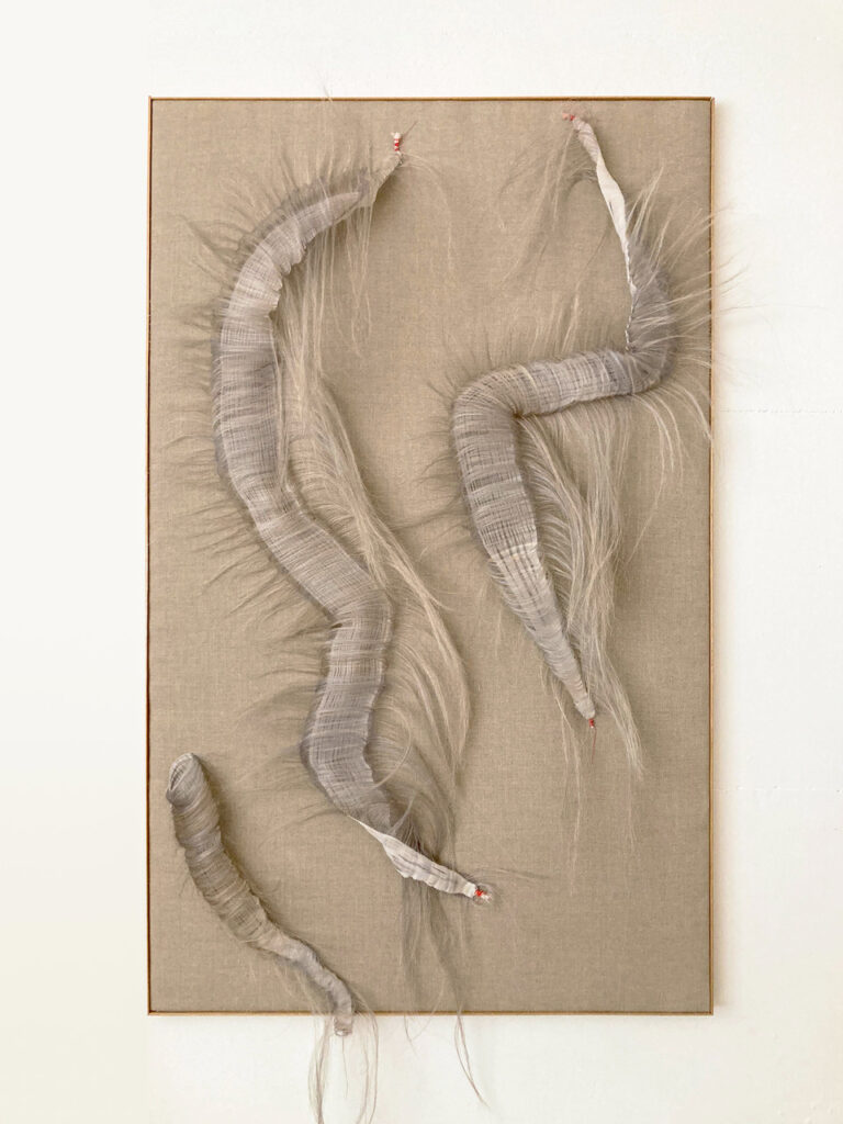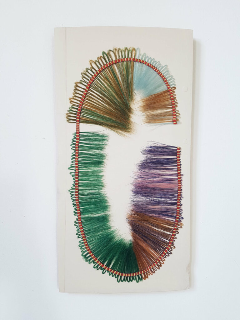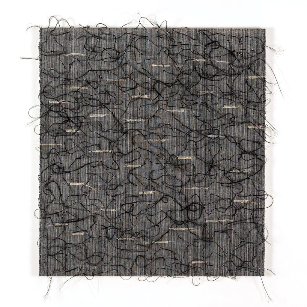 ‘Ten tijde van mijn eindexamen in Den Haag kreeg ik een opdracht voor het maken van panelen voor een interieur die ik heb geweven op een getouw van de academie. Tijdens het afstudeerjaar heb ik een paar weken mogen weven in het Textielmuseum op een getouw dat mechanisch was, maar ik kon het tijdens het weefproces stopzetten en met de hand paardenhaar verwerken en dan kon ik de machine weer aanzetten. Een paar stukken van mijn eindexamen heb ik in het museum geweven en het grootste deel op de academie. Het paardenhaar betrok ik van een fabriek in Aalten. Daarmee kreeg mijn werk een specifieke structuur door de beperkte lengte van het materiaal – de paardenstaarten zijn zo’n zeventig centimeter lang -, de kleuren in bruin, blond en zwart en de glans ervan.’