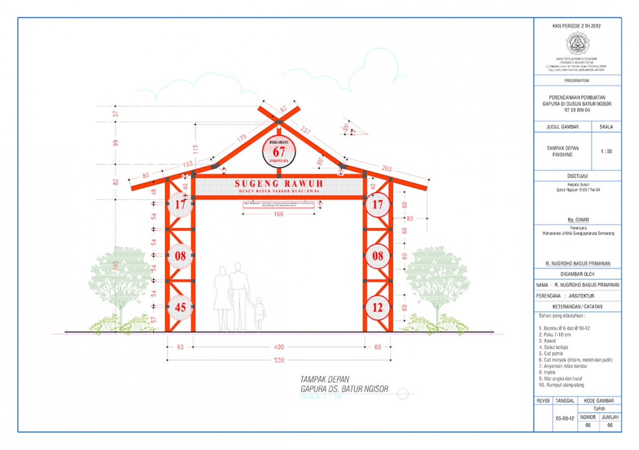Bouwtekening van een Gapuro, een erepoort uit de Javaanse traditie. Deze wordt opgericht bij de ingang van een kampong, of in kleiner formaat bij de ingang van een erf, bijvoorbeeld ter gelegenheid van een bruiloft. In klein formaat wordt een Gapuro vervaardigd van bamboe en versierd met palmbladeren en bloemen. Op de top van de poort wordt de knop van een bananenplant geplaatst. In Moengo woont een grote groep Javanen. In de eerste helft van de twintigste eeuw zijn ze vanuit het toenmalige Nederlands Indië als contractarbeiders naar Suriname gehaald. De bouwtekening van deze grote Gapuro komt van internet.
