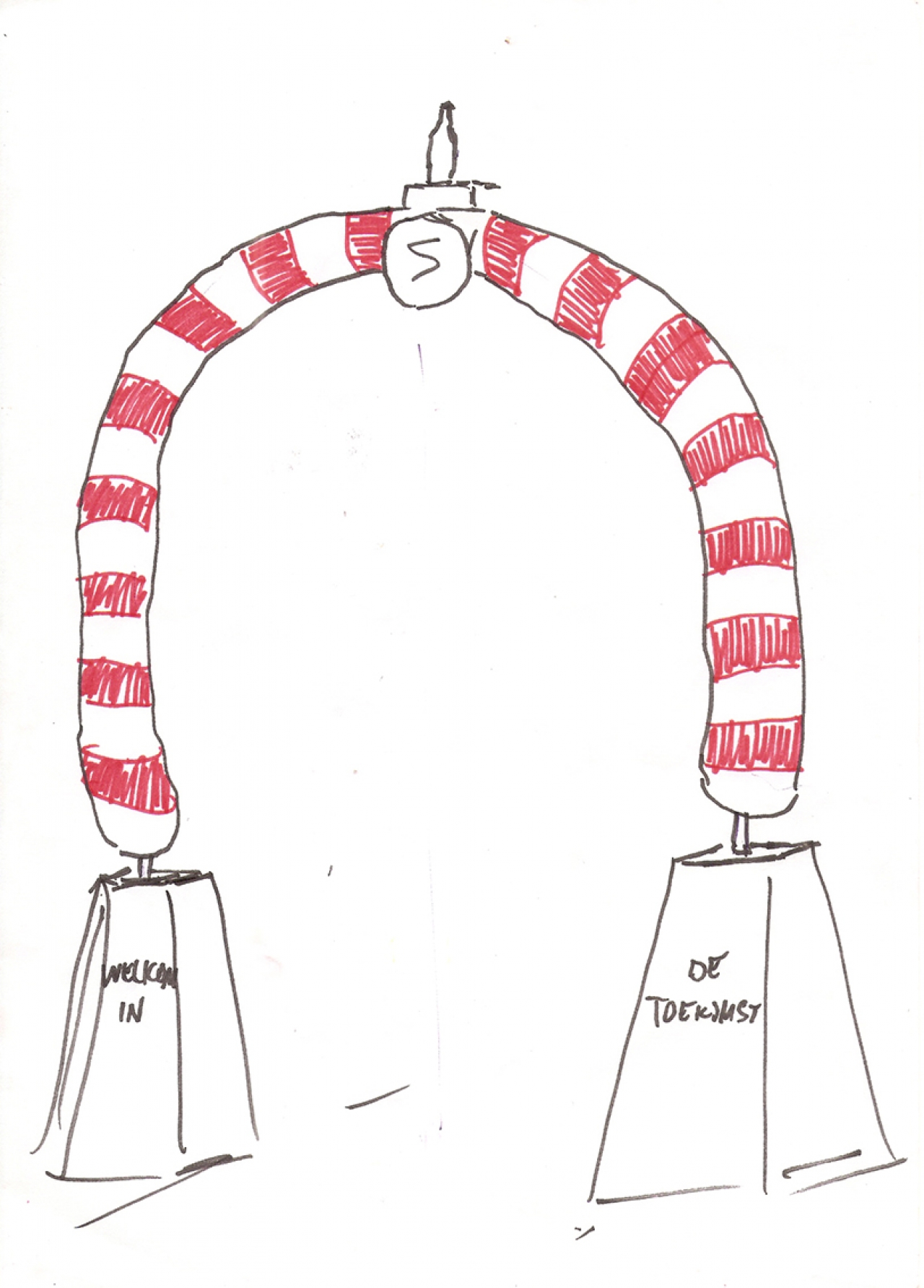 Titel van de te plaatsen poort is Welkom in de Toekomst. Op de sokkels die de poort dragen zal deze tekst te zien zijn. De boog zal geschilderd worden in signaalkleuren en op de top wordt aan beide zijden een ronde verkeersspiegel bevestigd. Bovendien zal de poort een soort spits krijgen, in de vorm van een uitvergrote knop van een bananenplant. Ik hoop dat de poort als een soort erepoort gaat werken – allereerst natuurlijk voor de mensen die er onderdoorgaan, lopend, met fiets, bus of auto, als markering van de continue stroom waarmee de toekomst in het heden valt. Elk moment biedt een nieuwe kans, ook (of misschien juist) als er achterstand, armoede of een oorlogsverleden is zoals hier. Vandaar: welkom in de toekomst!