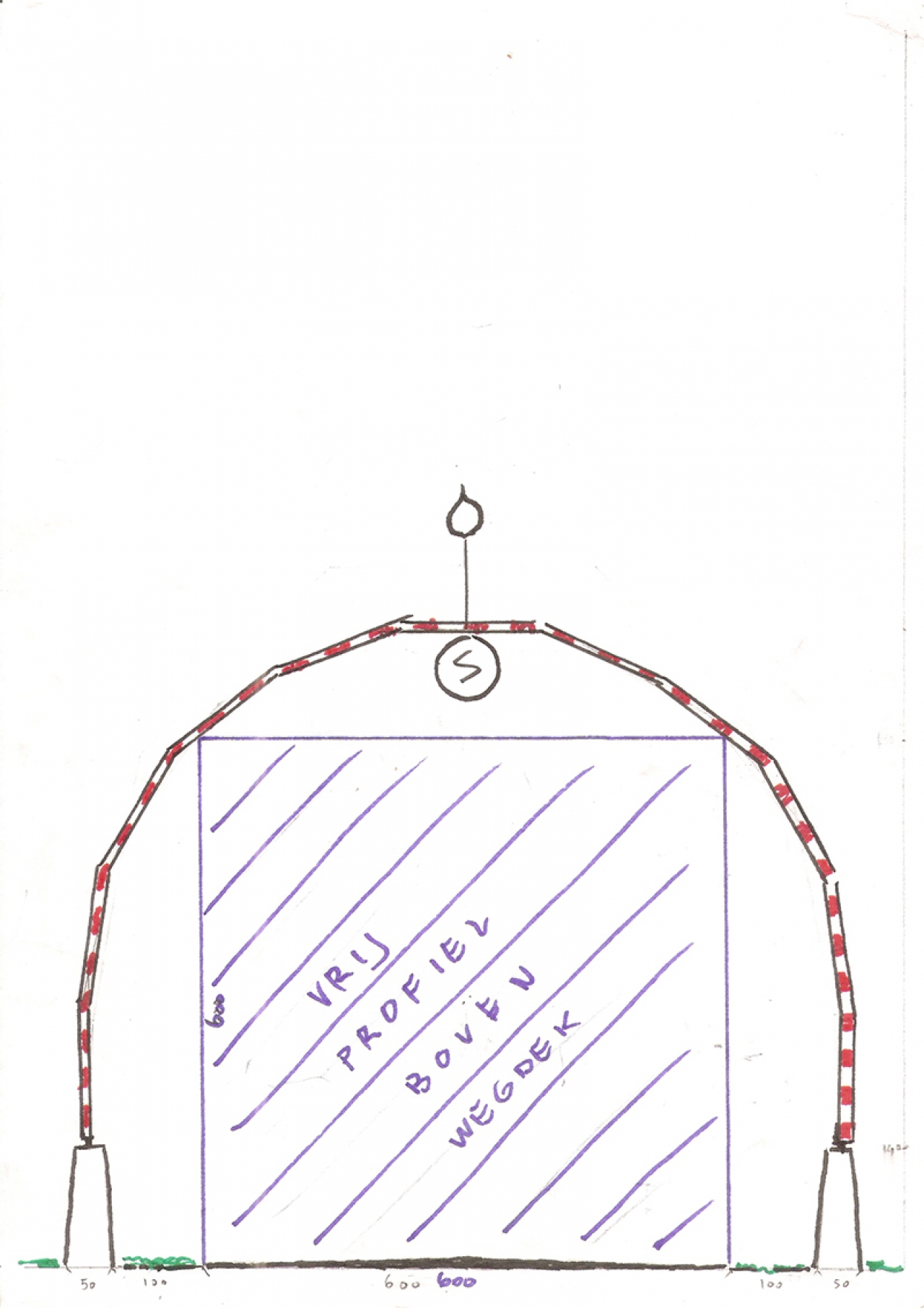 Tekening waarin de technische details zijn verwerkt noodzakelijk voor de toestemming van de districtscommandant – in het gebied rond Moengo wordt aan mijnbouw gedaan, vandaar de grote hoogte van de poort. De poort zal geplaatst worden centraal in Moengo, over de centrale weg tussen de bushalte bij Clockhouse en Tembe Art Studio, waarlang iedereen die Moengo binnen komt, gaat.