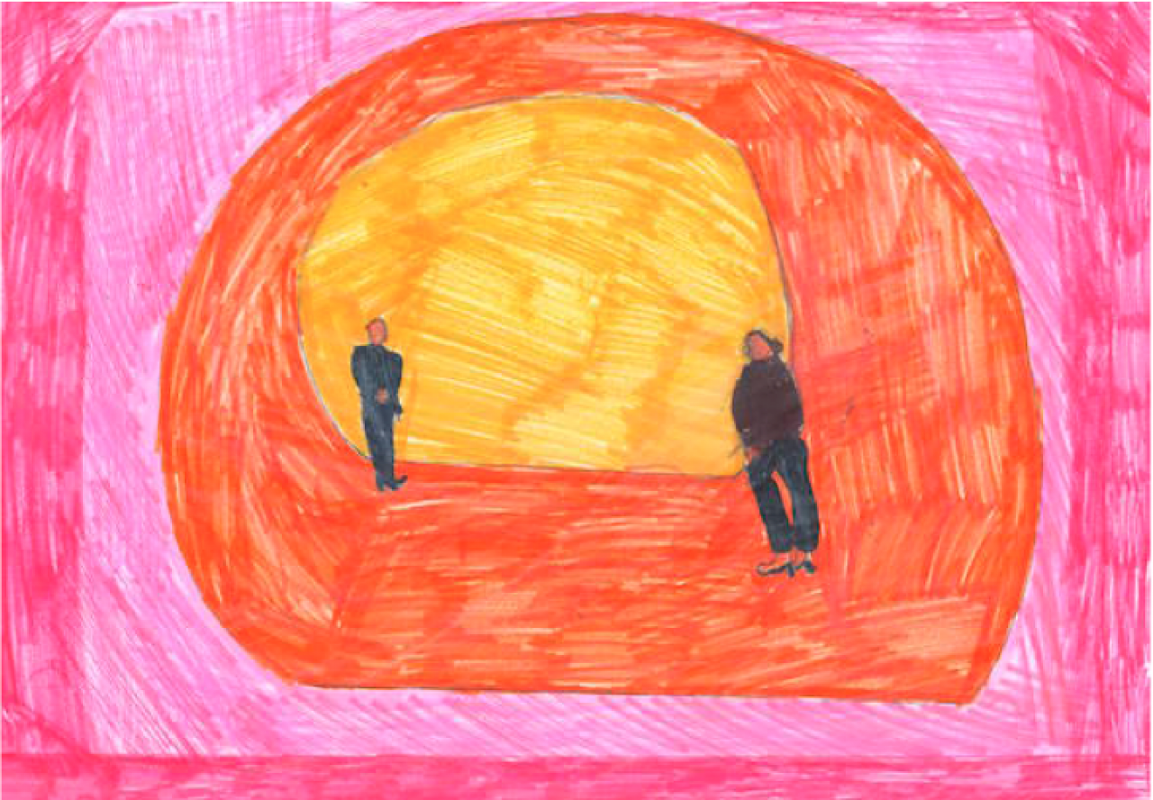 Nu liggen deze glorieuze dagen voorgoed achter me en is mijn blik op de wereld aardig veranderd. Ik ben nog steeds best content, maar ik kan helaas niet meer naar de wereld kijken op deze zoete manier. Daarom besloot ik mee te kijken door de ogen van mensen die dat nog wél kunnen. Ik nam een berg afbeeldingen van hedendaagse kunstwerken mee naar groep 7 en vroeg ze om een kunstwerk uit te zoeken dat hen aansprak, met de opdracht het werk zo goed mogelijk na te tekenen en er ook nog wat opbouwende kritiek bij te geven.