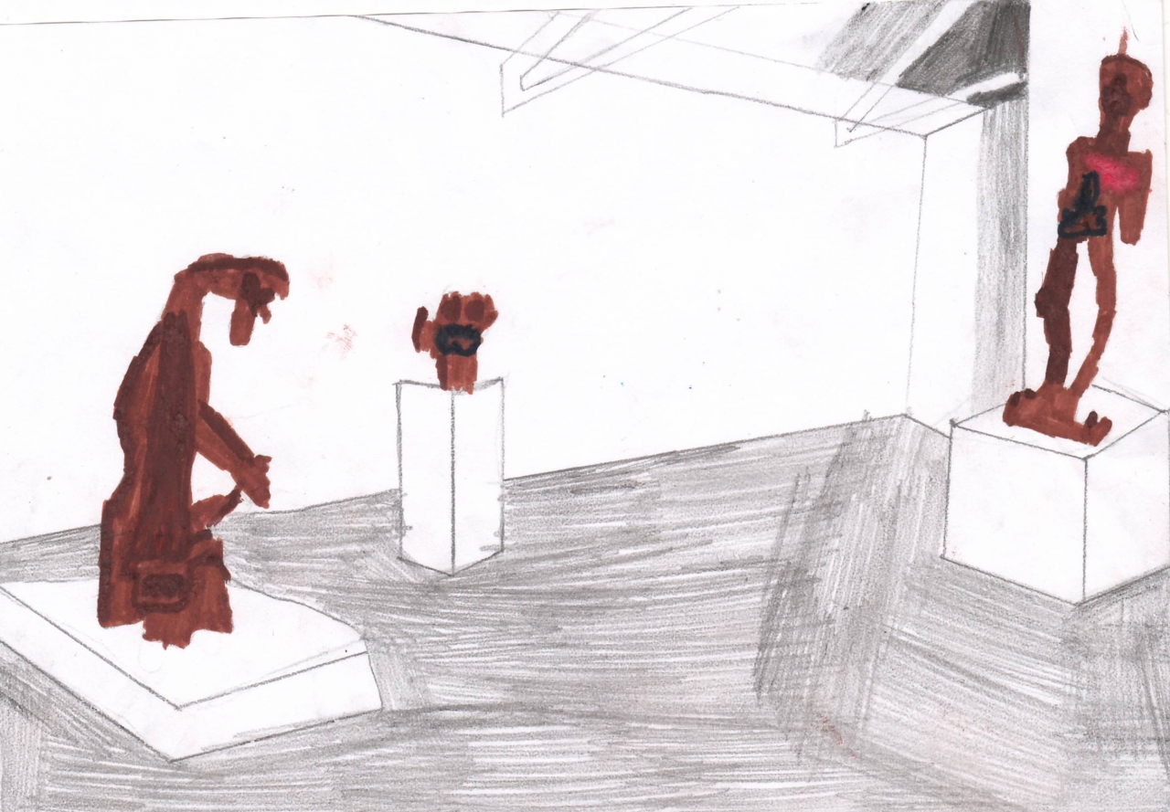 Ik nam een berg afbeeldingen van hedendaagse kunstwerken mee naar groep 7 en vroeg ze om een kunstwerk uit te zoeken dat hen aansprak, met de opdracht het werk zo goed mogelijk na te tekenen en er ook nog wat opbouwende kritiek bij te geven. De kritiek is helaas wat van de korte kant, aangezien al hun energie en dedicatie in het tekenen van de kunstwerken is gegaan en hun spanningsboog heel kort is. Toch hoop ik dat de makers van deze werken ontroerd zullen zijn door deze sprankelende her-producties en de korte maar zeer oprechte tips van deze jonge helden zullen koesteren.