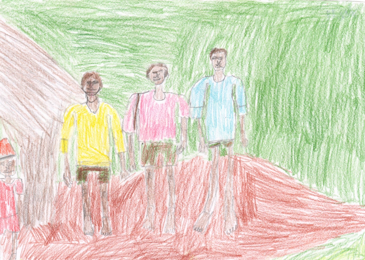 Ook Jelte vond het heel gaaf dat er nog stammen middenin de jungle wonen en dat Roye Villevoye daar langs gaat. Ik vertelde hem dat hij t-shirts mee nam in de kleuren die bij ons thuis in de printer zitten: geel, roze en blauw. Als de mensen in de jungle dat shirt aan doet ziet dat er best cool uit. Vooral als je bedenkt dat deze kleuren helemaal niet in de jungle voorkomen. Op de originele afbeelding knallen de kleuren van de foto, maar Jelte heeft ze alsnog geprobeerd in de jungle te laten op gaan.