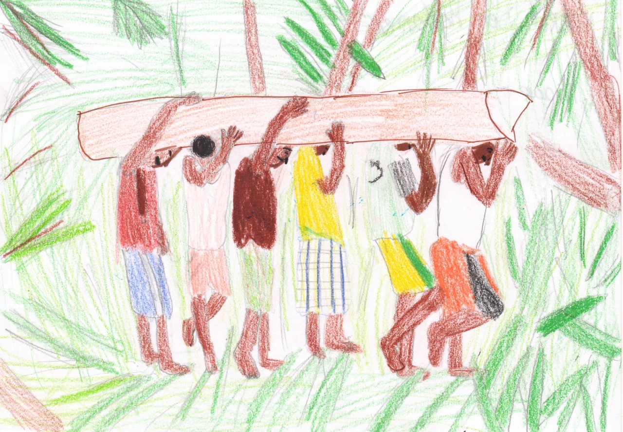 De afbeelding hier boven komt uit een film waarin je de stam een supergaaf beeld ziet maken. Op de afbeelding hebben ze net de boom gekapt en tillen ze hem naar de boot. Als je die film bekijkt hoor je ondertussen de kunstenaar bellen over geld. In de jungle zijn ze daar helemaal niet mee bezig (bellen of geld) en de mannen geven het beeld gewoon lekker gratis weg aan de kunstenaar. Marit vond het een mooi verhaal maar had nog wel een dikke tip voor de documentatie.