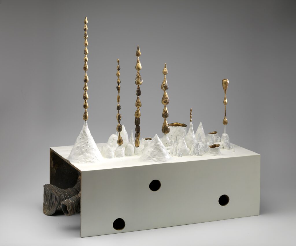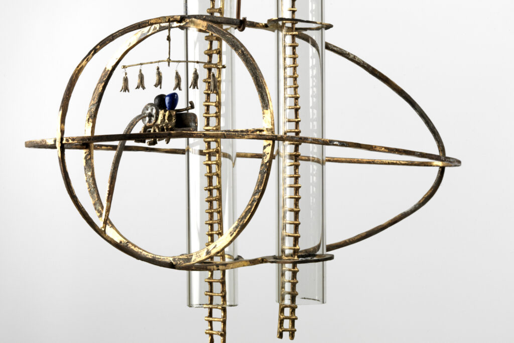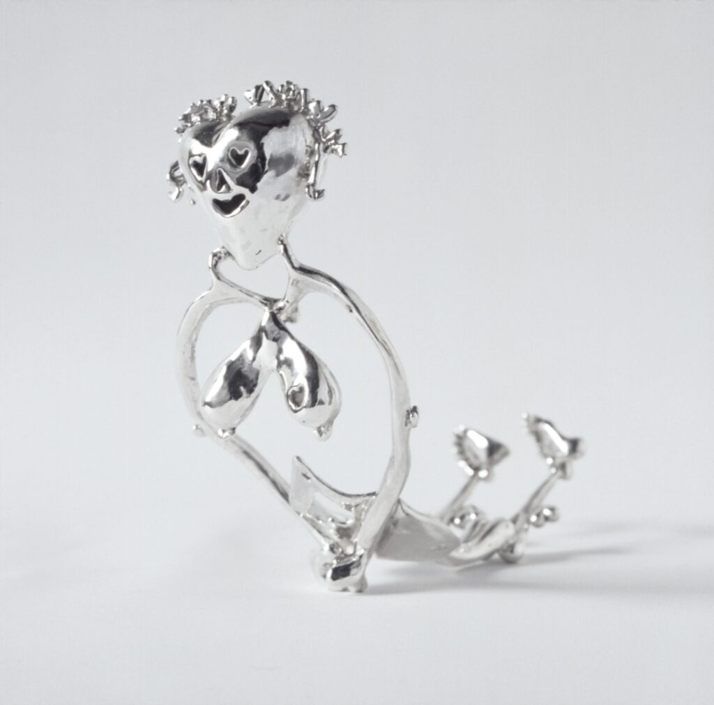 Al twintig jaar werkt Caro Bensca in een van de meest eigenaardige ateliers die ik ooit heb gezien. Het is een ruimte van zo’n anderhalve meter diep, vier meter lang en vijf meter hoog op de eerste verdieping aan de voorkant van een oud schoolgebouw in Amsterdam-Oost waar ook kunstenaars als Mirjam de Zeeuw, Merijn Bolink en Jan van der Ploeg ateliers hebben. De smalle, hoge, krappe werkruimte van Caro Bensca is een vertrek waar wellicht ooit een conciërge zich ophield. Toch past dit atelier haar goed. Het is een ruimte waar je uit moet barsten. Ze maakt zich waar met beelden die geen voor- en achterkant hebben en die vanuit alle gezichtspunten kunnen worden benaderd. Op een hoge tafel staat een beeld van een stenen rots met daarop een landschappelijk plateau, met een verzilverd en verguld hek, een boom en een dier in de vorm van een stokpoppetje met schoentjes aan die door middel van scharniertjes ten opzichte van elkaar kunnen bewegen. Alle onderdelen van deze ingenieuze sculptuur kunnen ten opzichte van elkaar een veranderende positie innemen waardoor het beeld zich voordoet als een innerlijke tegenstrijdigheid. De maatvoering is bepalend voor haar werk. Hoewel Caro Bensca tijdens haar loopbaan enkele grote werken in de openbare ruimte heeft gemaakt, zijn de beelden in haar werkruimte in hun omvang beperkt, maar eigenaardig genoeg in hun innerlijke verhoudingen weer immens, zoals een kleine hand die een zaadje toont dat op het punt van ontkiemen staat, of twee zilveren handjes die een aantal losse gekleurde garens tegen een achtergrond van transparante tule vasthouden waaraan een naainaald als het gewicht van een klok is bevestigd. Dit fragiele evenwicht, verbeeld met losse, gekleurde draadjes uit de nalatenschap van haar moeder, voert terug op haar jeugd.