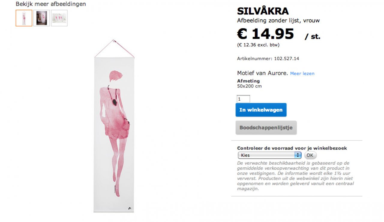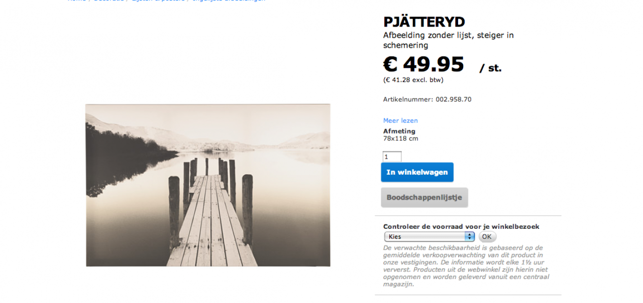Ikea Amsterdam Zuid Oost, het is woensdagmiddag 13.30. Ik moet een half uur van mezelf observeren. Ik tel de mensen op de decoratie-afdeling die een poster, of ingelijste plaat kopen; het zijn er 34. Als ik vraag naar de motivatie van de aankoop, worden kleur, formaat, ‘gewoon mooi’ en ‘het doet me aan iets denken’ als voornaamste redenen opgegeven. Ook wordt geld genoemd, want IKEA kunst is niet duur. ‘Het is een spontaan cadeau’ zei een vrouw met een schilderij onder haar arm (Lieve hemel, denk na voordat je een lichtroze aquarel van 2 meter lang cadeau doet.) Ik fotografeer de IKEA bezoekers met hun aankopen, totdat er een roodaangelopen floormanager arriveert en ik mee moet komen. Ik probeer nog te benadrukken dat hij in een van de grootste galeries ter wereld werkt en vraag hem of hij weet wie de makers zijn van de foto’s, schilderijen en platen? Het enige antwoord dat ik krijg is dat ik geen toestemming heb gevraagd aan IKEA voor het maken van de foto’s. Achter mijn schouder kijkt hij toe terwijl ik een voor een mijn foto’s wis.