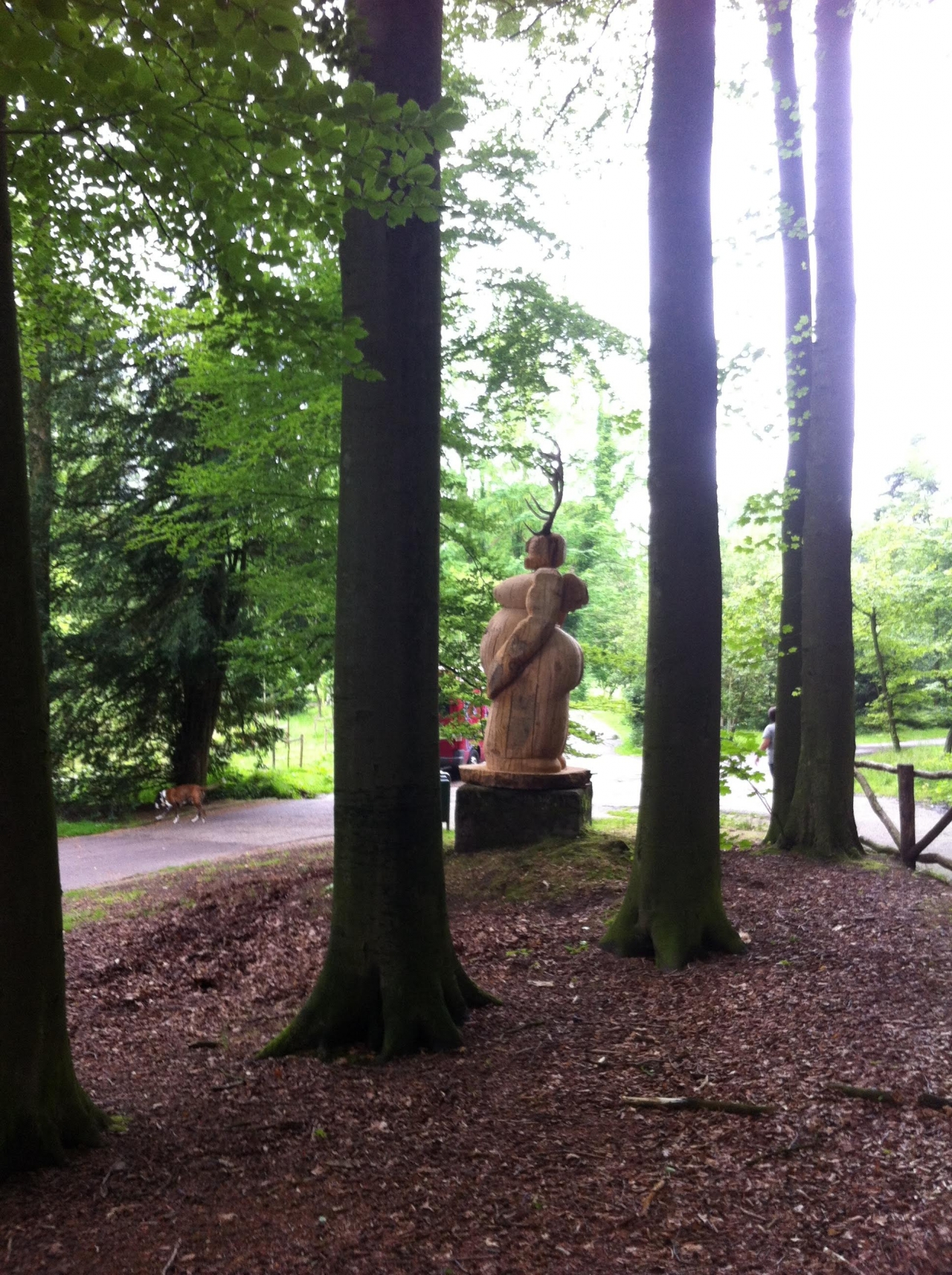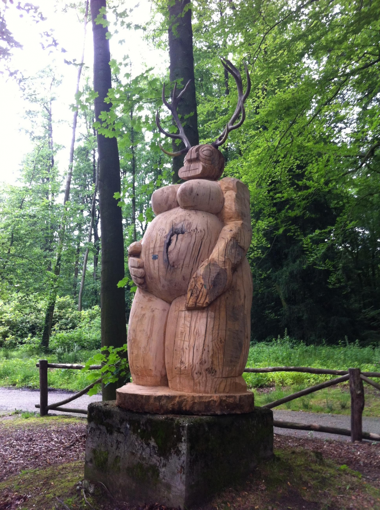 Tussen het Chinese restaurant en de vijver waar beelden Van Creten staan is nu een massief groot eiken houten beeld op een sokkel gezet.
