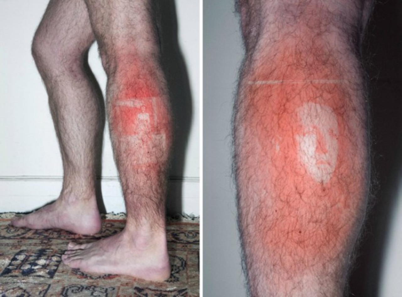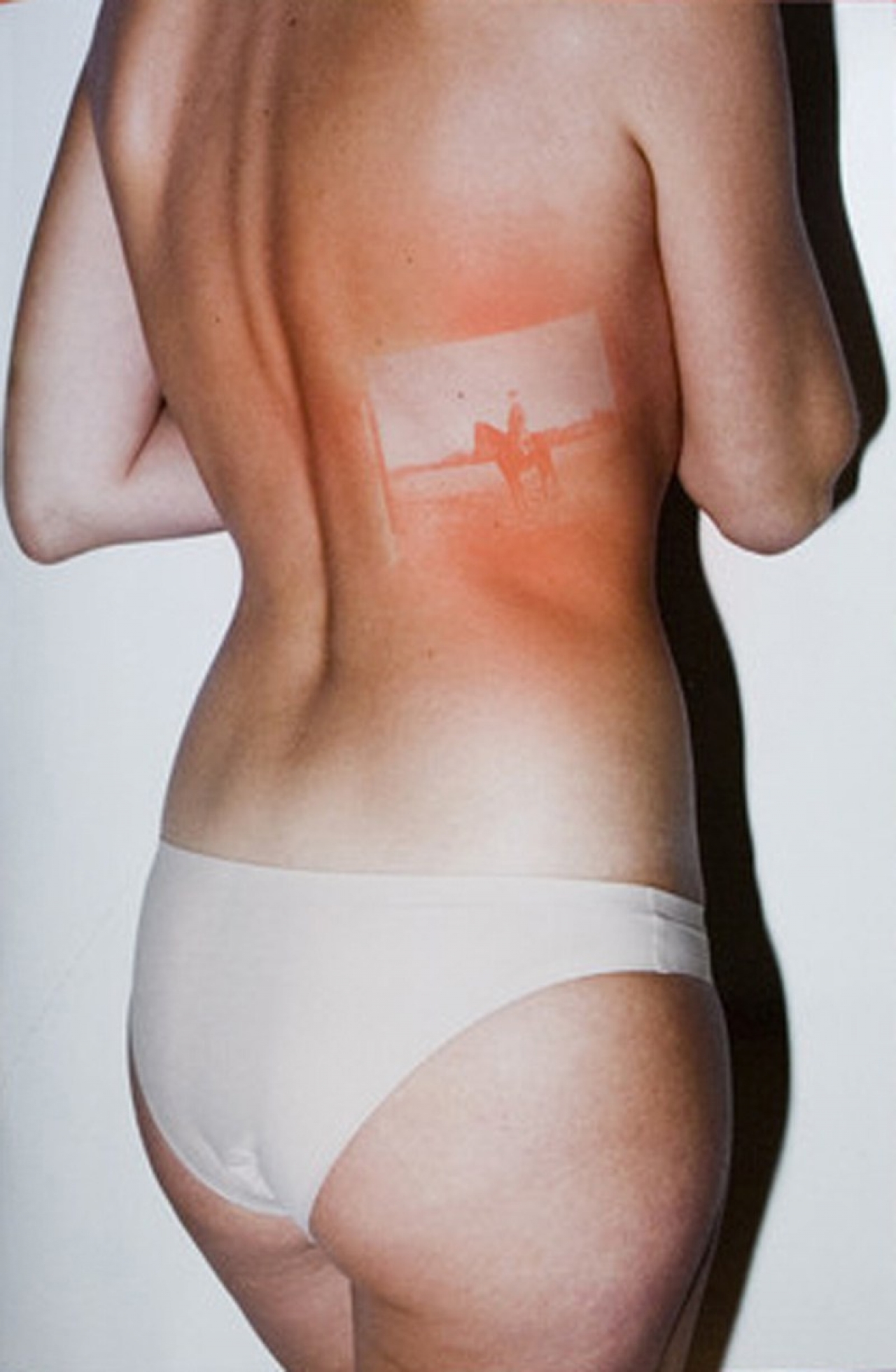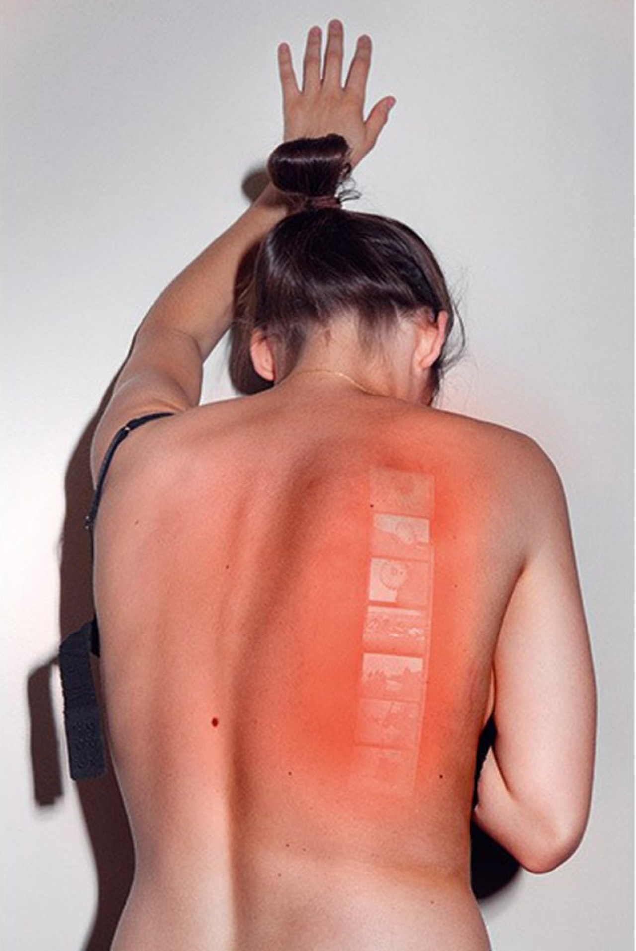 De Franse kunstenaar Thomas Mailaender nam de praktische kant van het ontwikkelen van zijn foto’s naar een nieuw niveau met deze performatieve manier van foto’s ontwikkelen. Mailaender drukte 23 negatieven van archieffoto’s op de lichamen van zijn modellen/proefpersonen en gebruikte licht om de beelden op hun huid te verschroeien. Dit proces, het tijdelijk overbrengen van negatieven op de huid, heeft volgens de kunstenaar een soortgelijk effect als zonnebrand: de beelden zijn zo vluchtig, ze beginnen alweer te vervagen zodra ze worden blootgesteld aan daglicht..