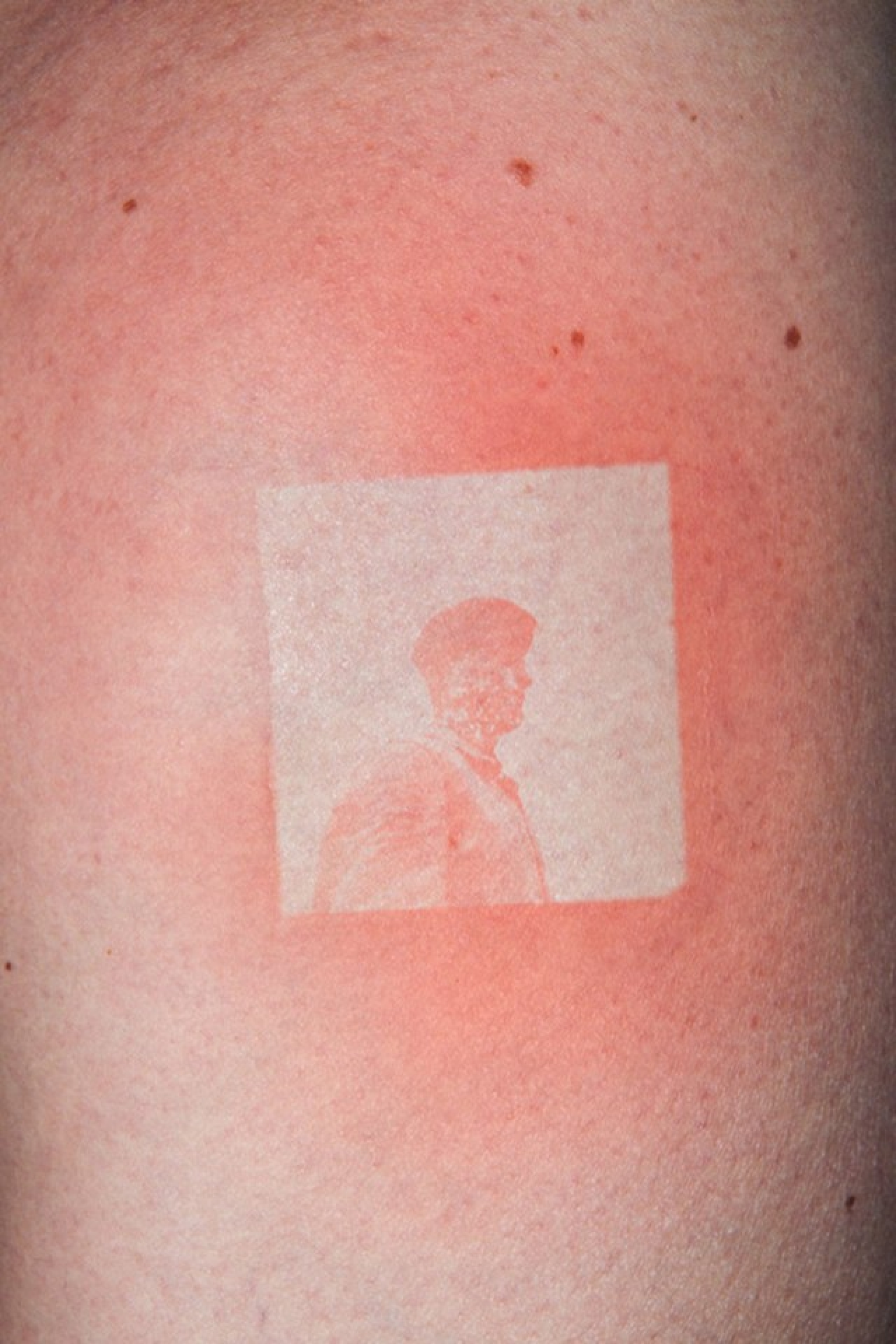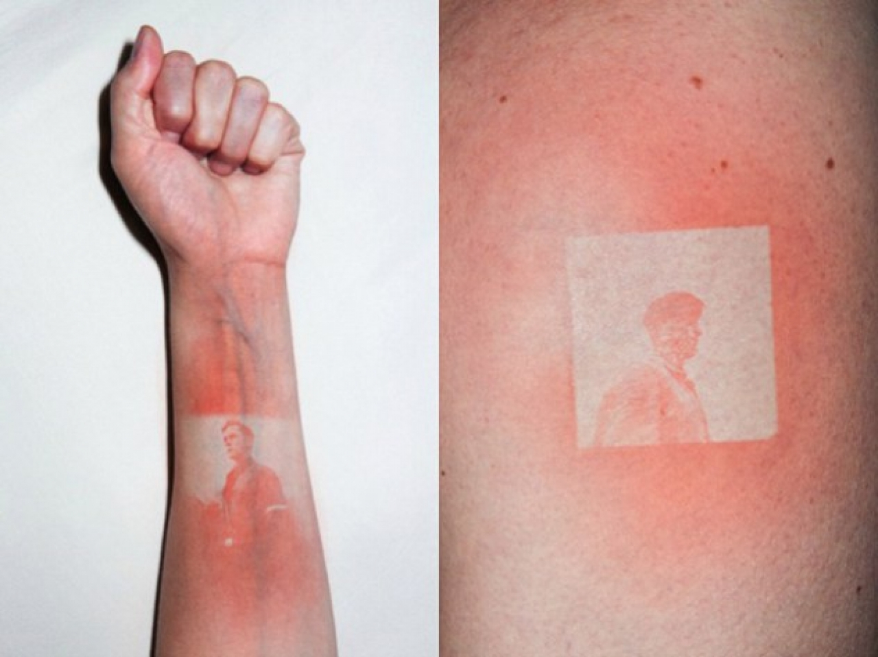 Illustrated people: de bleke huid – die al zijn opgespaarde pigment van vorige zomer is verloren – als lichtgevoelig papier. Zodat een sterke UV-lamp de huid kan gebruiken om het negatief van een foto af te ‘drukken’ op het menselijke canvas.