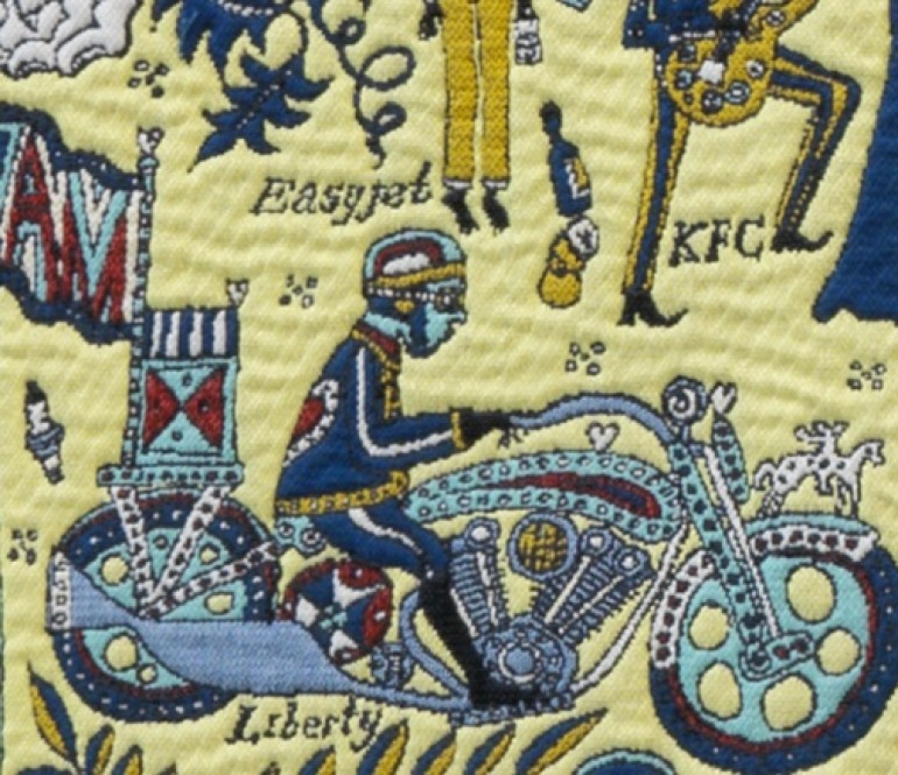 The Walthamstow Tapestry heeft meer middeleeuwse verwijzingen. Zo zien we een zwaarbeladen handelskogge met een heraut in de korf mand dobberen op de scharlaken rivier van bloed. In de verte klinkt het tapijt van Bayeux en de Zweedse Överhogdal doeken door met hun drakarschepen en wirwar van tuimelende figuurtjes. Perry geeft zelf ruiterlijk toe dat hij moeilijk naar een leeg doek kan kijken, zijn werk is dan ook een schoolvoorbeeld van horror vacui. Tot ver voorbij de middeleeuwen werd immers verondersteld dat de leegte een tegennatuurlijk verschijnsel was: de natuur duldt geen plekje onbedekte grond en vult deze terstond op met allerlei kiemen en sprietjes. In The Walthamstow Tapestry zien we dit middeleeuwse devies verwerkt in een uitzinnig millefiori motief. Maar anders dan op de befaamde Cluny tapijten waar een hoofse dame elegant verpoost in een jardin cloisonné, is het beeld niet gevuld met fabeldieren en exquise flora. De duizend bloemen van Perry bestaan uit minutieus geborduurde logo’s en merken die zich laven aan de dromen van het gewone plebs. Het maakt dat je een diep medelijden voelt met het gestikte personage dat telkens weer verblind wordt door de illusie dat vervulling te vinden is in een winkeletalage. Maar het roept ook de vraag op of men zich werkelijk kan onttrekken aan de grootschalige exploitatie van menselijke verlangens? De geschiedenis leert dat de menselijke soort niet goed bestand is tegen gewiekste vormen van operant conditionering, onze frontale cortex reageert helaas als een gewillige merrie op stimuli die zo omnipresent zijn.
