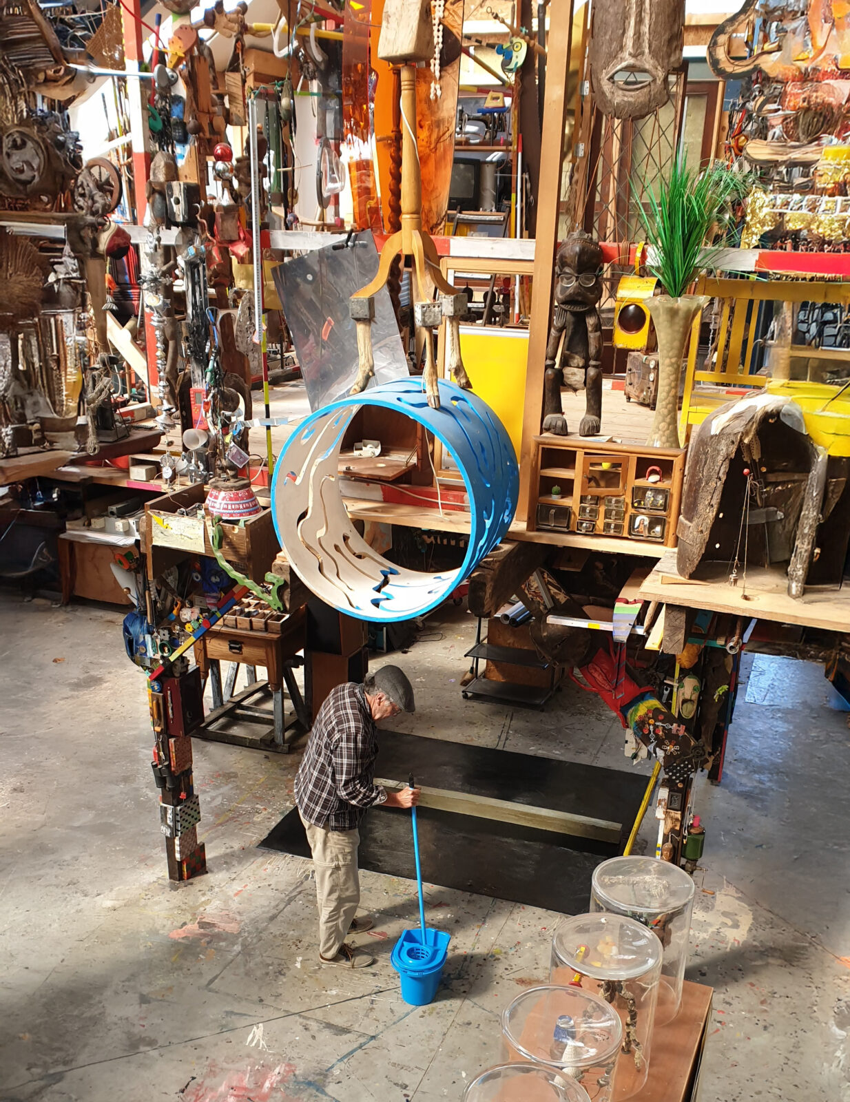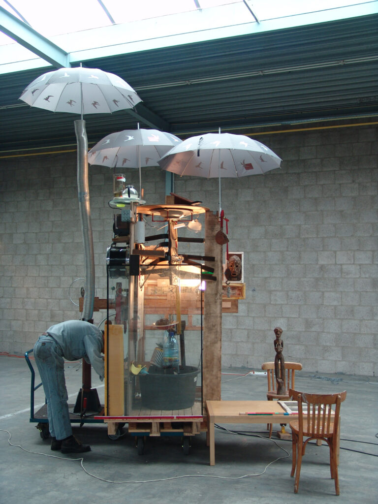 Als ik hem in Abcoude bezoek is het eerste wat opvalt in de grote loods een bak die in het midden van de ruimte steeds een druppel uit een lek in het bovenlicht in het dak opvangt op deze regenachtige dag. De opeenvolgende druppels die van grote hoogte neervallen klinken in hun regelmaat als een metronoom die door John Cage is neergezet om de tijd als een ritme op te vatten.