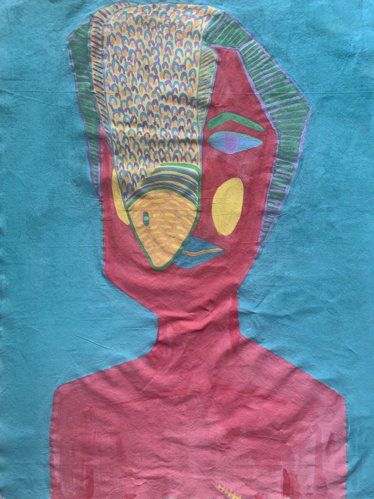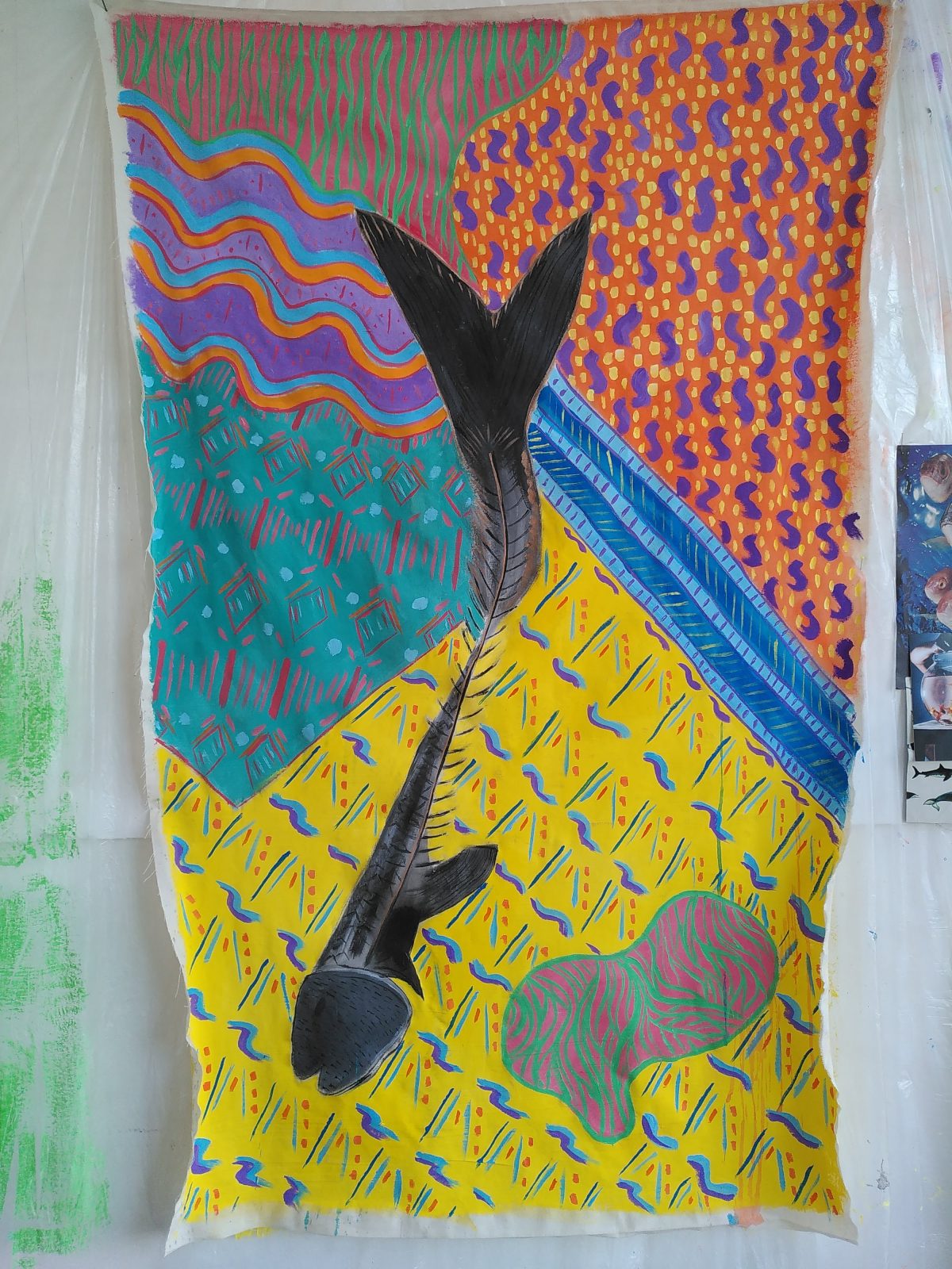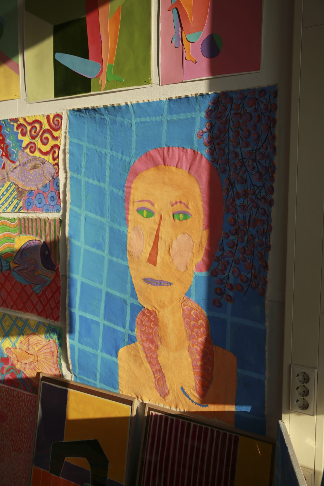 Sinds drie jaar schilder ik portretten van mensen en van vissen, ik begon klein met BIC-pen in mijn dagboeken, ging over op oliepastelkrijt op A4 papier, kocht toen steviger papier en werk nu met acrylverf op ongebleekt katoen. De groottes lopen uiteen, van halve tot bijna vier meter.