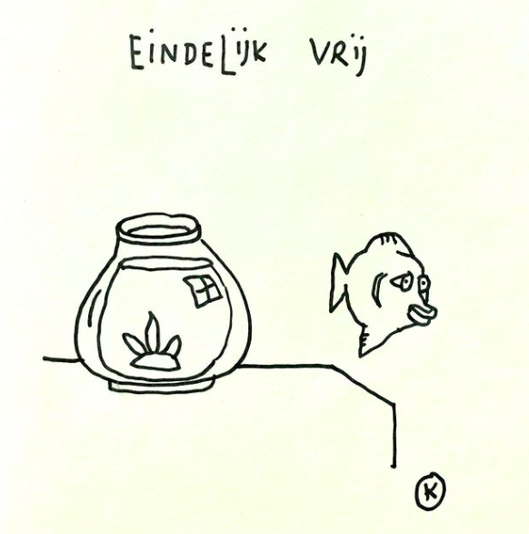 Dat er sinds de zeventiende eeuw maar weinig vissen werden geschilderd is onzin, althans als ik over mijn instagramfeed scrol zie ik ze wel degelijk. Veel kunstenaars die ik volg hebben weleens een vis getekend, geschilderd dan wel een kapstokje gemaakt in de vorm van een vis, een keramieken beeldje gemaakt in de vorm van-, een tekening, een schildering, een sculptuur, een vaas die ineens een – of schrijvers die een stuk dan wel een heel boek schrijven over – Misschien zegt dit iets over mijn algoritme, maar wat mij opvalt is dat de vis voor iedereen iets anders betekent – hier kom ik later uiteraard op terug.