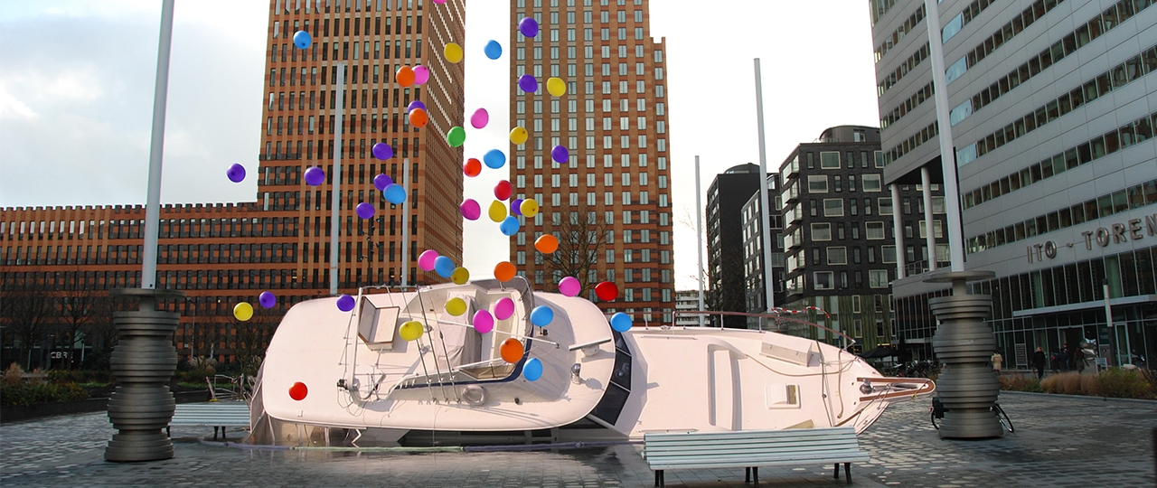 Een schip van 15 meter lang ligt vanaf morgen midden op het Gustav Mahlerplein op de Zuidas, voor de ingang van het kantoor van ABN Amro. Het superjacht Fortuna is op het plein gestrand en gekapseisd, in een kunstproject van Leonard van Munster. Lees verder