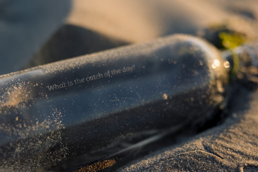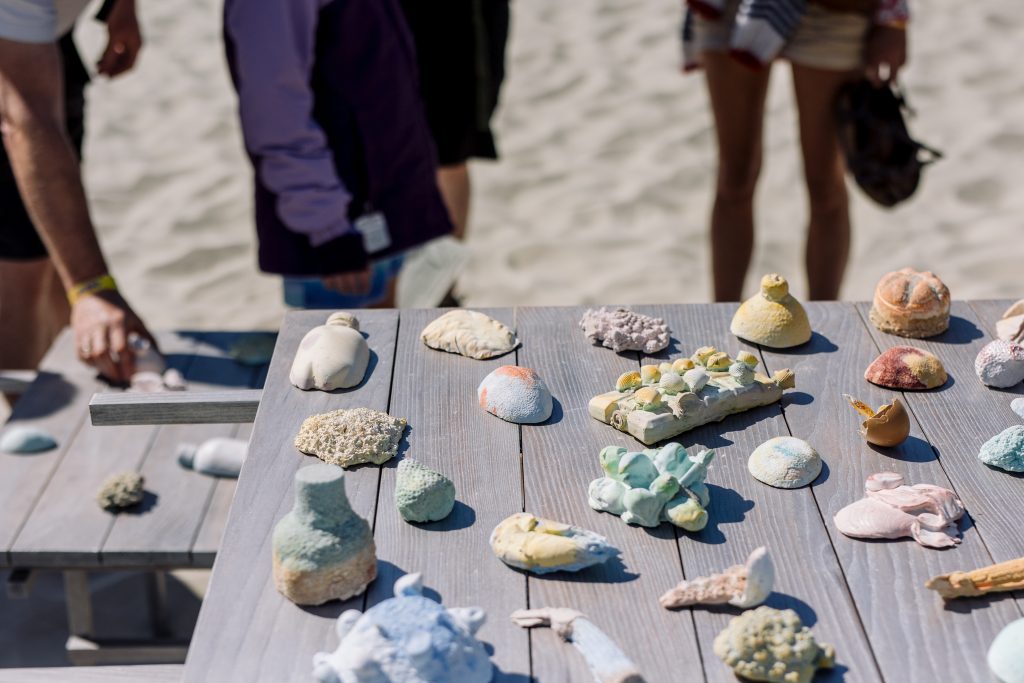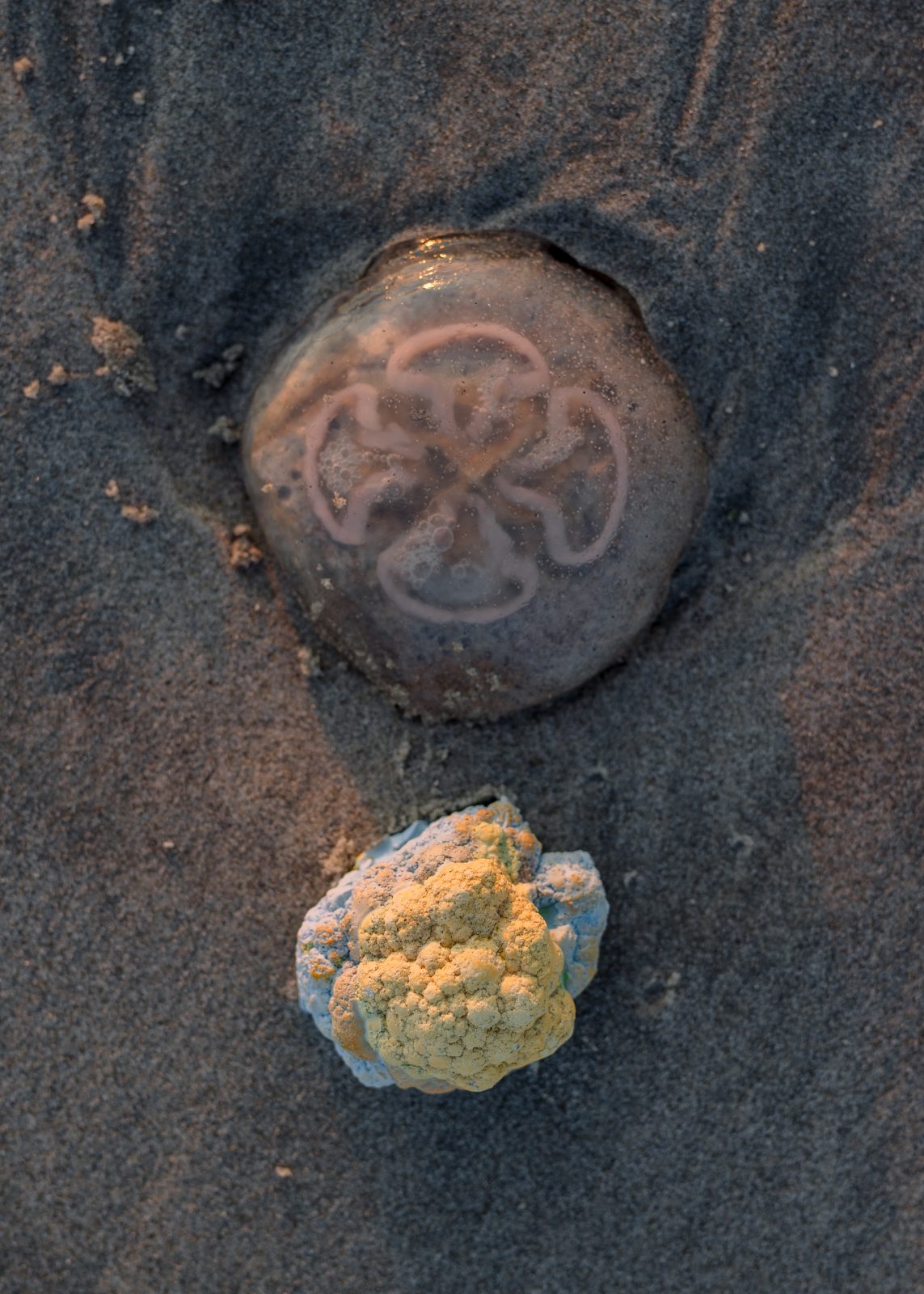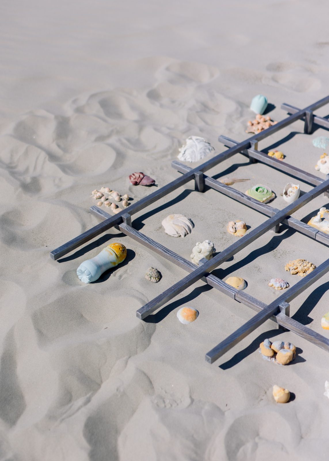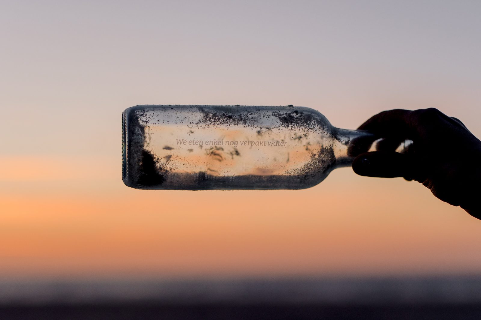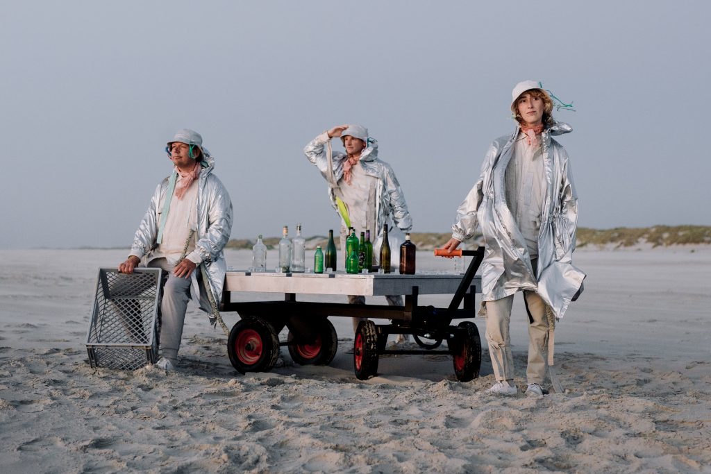 Terug naar het strand van Terschelling, waar Oerol-bezoekers met behulp van een reeks oefeningen een gangpad van de Interspecies Supermarket verkenden. ‘Tel hoeveel golven het duurt voordat je de duinen uit bent.’ ‘Trek een cirkel in het zand om je heen, en kijk en denk na over wie er allemaal te vinden zijn in de atmosfeer van deze bubbel.’ ‘Waar valt je schaduw eigenlijk op dit moment?’ Vergezeld door deze oefeningen en een gejutte fles of een kalkobject, volgde men de route terug naar zee, waar men aan de hand van een reeks vragen werd uitgenodigd een nieuwe plek in het immer veranderende voedselweb te vinden voor hun ‘product.’Vragen zoals: ‘In wat voor landschappen vonden de ingrediënten op het label van de lege fles hun herkomst?’ of ‘Op wat voor nog-niet-bestaande afdeling komt het hybride object in de toekomst te liggen?’ Met behulp van minimale ingrepen in het landschap, zoals gekleurde palen die de contouren van de vloed aangeven, legde de Onkruidenier de basis voor de installatie die geactiveerd zou worden door de festivalbezoekers. De gekleurde palen maakten het mogelijk de aanwezigheid van het water ook bij eb terug te traceren, waardoor het decor duidelijk maakte hoe rekbaar de kustlijn is, ook al is deze netjes in kaart gebracht. Omdat de flessen en kalkobjecten die door het publiek meegedragen werden de hele dag door op andere plekken op het strand belandden, veranderde de installatie continu. Transformaties spelen niet alleen in het verleden en de toekomst, maar vinden actief nu plaats, en wij zijn daar onderdeel van.