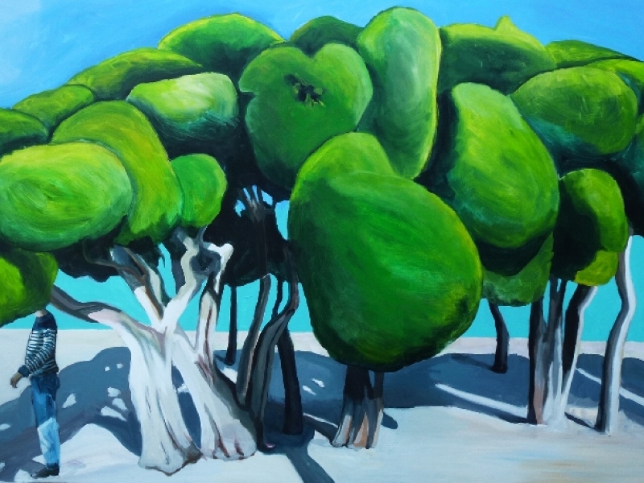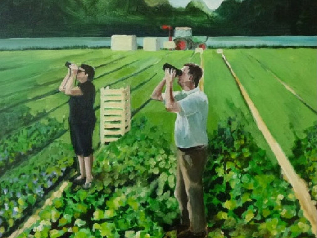 Deze tentoonstelling begint bij Marian Mijnhardt (1961) die werd uitgenodigd om te exposeren in Cultura Ede. Zij vroeg meteen of ze andere kunstenaars mocht uitnodigen om met haar ten toon te stellen. Dat mocht. Dat ze die vraag heeft gesteld is niet zo verwonderlijk als je naar haar schilderijen kijkt. Daarin komen vaak in bosachtige landschappen en mensen voor die op een bepaalde manier toenadering zoeken tot elkaar of tot de omgeving waarin ze zijn beland. Enerzijds gebeurt dat met eigentijdse middelen als verrekijkers of mobiele telefoons, en anderzijds is er ook sprake van een wisselwerking tussen de mensen en dingen die van alle tijden is. Bij haar is dat regelmatig een vorm van observatie tussen de bomen door om het bos te kunnen zien. Je proeft in haar schilderijen een zekere mate van maatschappijkritiek, maar die is zo lichtvoetig dat je je niet moreel belaagd voelt. Door kleurgebruik en de onbekommerde verftoets, de zorgeloze omgang met realisme en figuratie ontstaan taferelen die een vanzelfsprekend karakter hebben. Meestal gaat in die onbekommerde stijl iets vreemdsoortigs schuil waardoor je bij het kijken een bepaald ongemak te boven moet komen. Pas dan ga je echt goed kijken. Hoe gewoner de geschilderde gebeurtenis is, des te verrassender is haar weergave ervan.