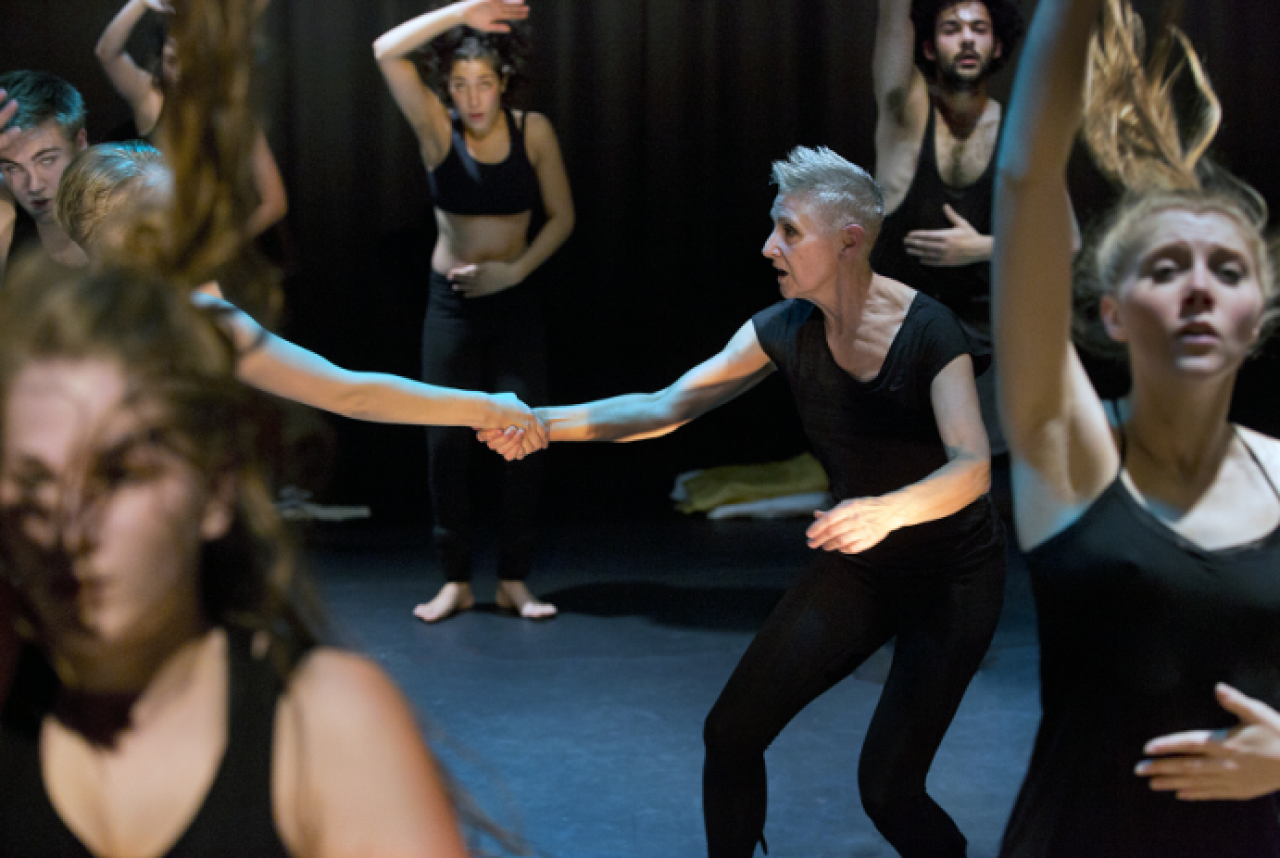 Als Truus Bronkhorst het speelveld in kaart heeft gebracht, de hele oppervlakte heeft bezworen, bestormen negen spelers wild de lege ruimte en nemen die in bezit met sprongen, draaien, liften en door elkaar te slaan en te schoppen totdat ze buiten adem zijn. De acteurs die geen getrainde dansers zijn hebben zich een bewegingsidoom eigen gemaakt dat hun persoonlijkheid recht doet en die ze met elkaar uitproberen in een collectief verband of belang. Terwijl de groep over het speelvlak dendert, verlies je Truus Bronkhorst uit het zicht, maar ze is er steeds. Ze steekt haar hoofd in een emmer water, ze strijkt haar korte grijze haar achterover, ze komt op adem, ze ziet het aan, ze verhoudt zich stil tot de hopeloze uitbundigheid en loze agressie van de negen spelers.
