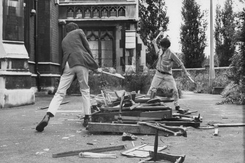 - Artists Ralph Ortiz (left) and Paul Pierrot demolishing a piano during the Destruction in Art Symposium (DIAS)
