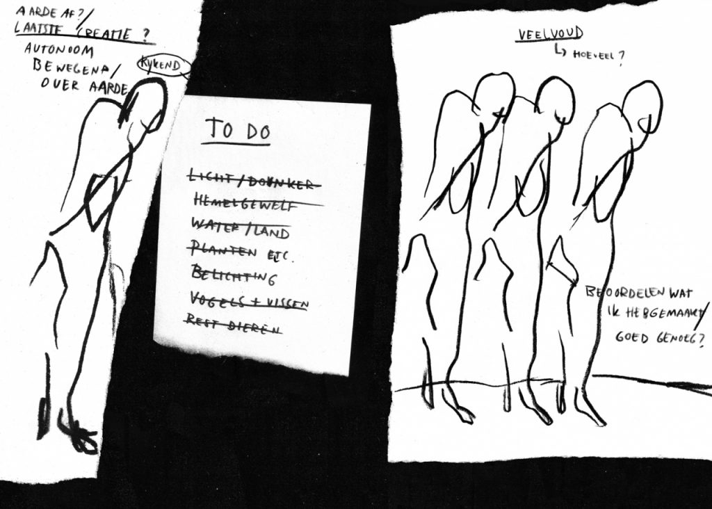 Een kunstenaar die op de 6de dag de wereld had voltooid maar nog niet tevreden was. Hij gooide zijn rustdag overboord om zijn laatste dag te besteden aan een laatste experiment: de mens. Kunstenaar (en studiogenoot) Aukje Dekker schreef er een verhaal over.