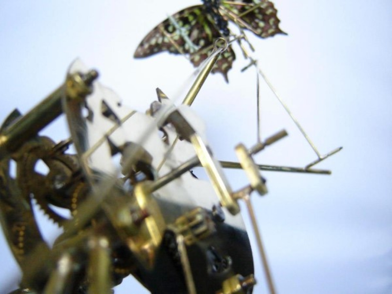 Léon van Opstal (1981) stelt vraagtekens bij de technologische vooruitgang van de mens door bestuivende insecten te voorzien van mechanische aandrijvingen. Zijn weg van werk naar huis lag eens bezaaid met dode hommels en bijen waarna de globale bijenproblematiek al snel een rol aan nam binnen zijn creaties. Tussen de filligraine messing stangen, scharniertjes en tandwielen komt men een van de verborgen strijders der natuur tegen; een vlinder. Pas bij de tweede blik ontdekt men de subtiele accessoires die het voortbestaan van het hand aangedreven insect zullen moeten garanderen. In eerdere werken zien we een fascinatie voor anatomie terug waarin met eenvoudige aandrijvingen de functie van het bewegen ‘der menschelijke hand’ centraal staat. Staal gecombineerd met afgegoten vingers geven het werk een geheel eigen bestaansrecht. De drie jonge kunstenaars wonen en werken momenteel in Amsterdam.