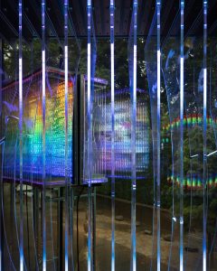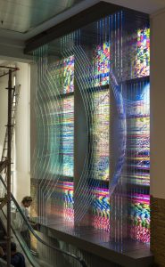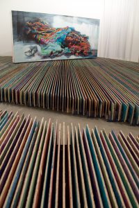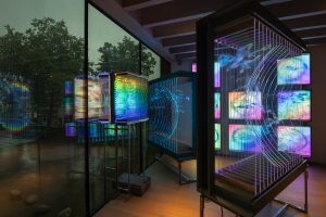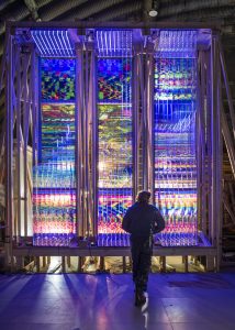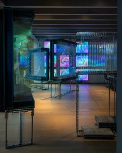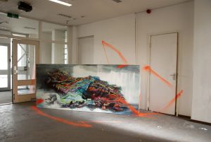 Deze week is Jop Vissers Vorstenbosch te gast bij Kunst is Lang. Jop is naar eigen zeggen een ‘schilder die er van alles bij verzint.’ Bijvoorbeeld door zijn schilderijen te tonen in zelfgebouwde sculpturale omgevingen, die een sterk bepalende context toevoegen, maar ook door een lichtbak als basis te nemen en er verschillende lagen beschilderd plexiglas voor te plaatsen. Zo ontstaan er schilderkunstige installaties waarin, in plaats van de lagen verf bij een traditioneel schilderij, lagen van licht en materiaal het beeld bepalen. Voor onder meer festival Into The Great Wide Open zet Jop deze combinatie in om een groep meterslange werken te maken die refereren aan het haperende licht van een stervende tl-balk.