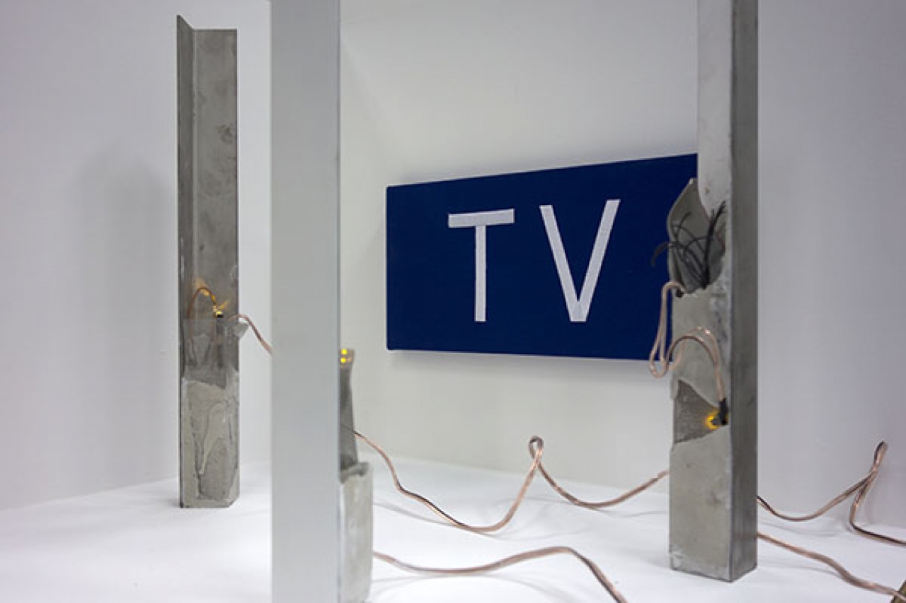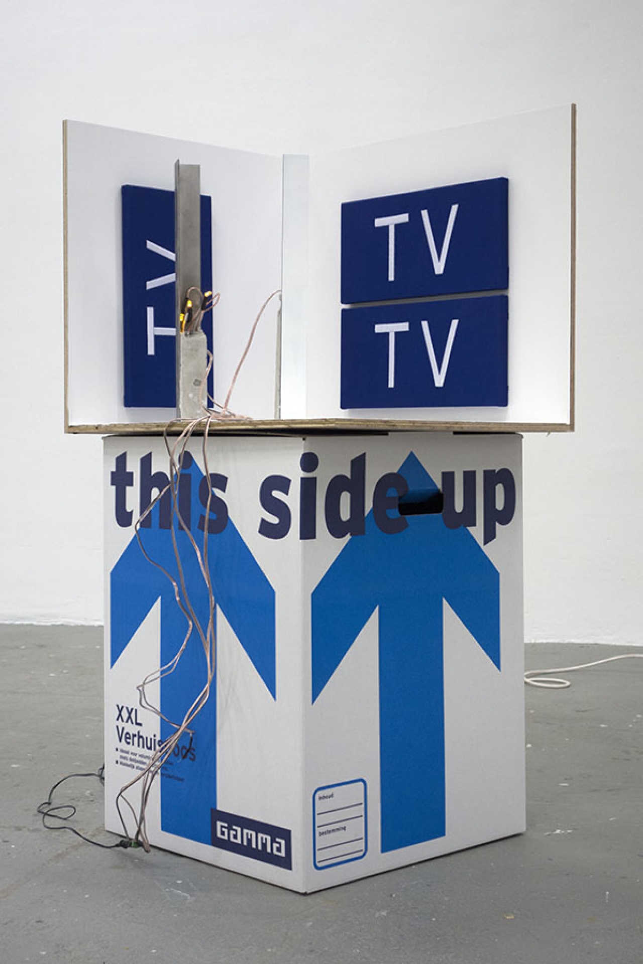 De subjectieve wereld van Daniel Roth staat in Jolly Joker oog in oog met de publieke ruimtes van Bryan Dooley. Midden in de salon staan twee maquettes die op GAMMA verhuisdozen zijn geplaatst. Er hangen canvassen met daarop ‘TV’ in grote witte letters geweven, de blauwe achtergrond representeert het blauwe licht van een scherm. Ook zijn er verschillende pilaren te zien waaruit gelige LED lampen steken. Bryan Dooley maakte dit kunstwerk naar aanleiding van zijn expositie die een maand geleden te zien was in New York. Hij noemt de kunstwerken ‘Reverse maquettes’, ze hebben geen voorbereidende of schetsmatige waarde meer, maar functioneren als een nabeschouwing.