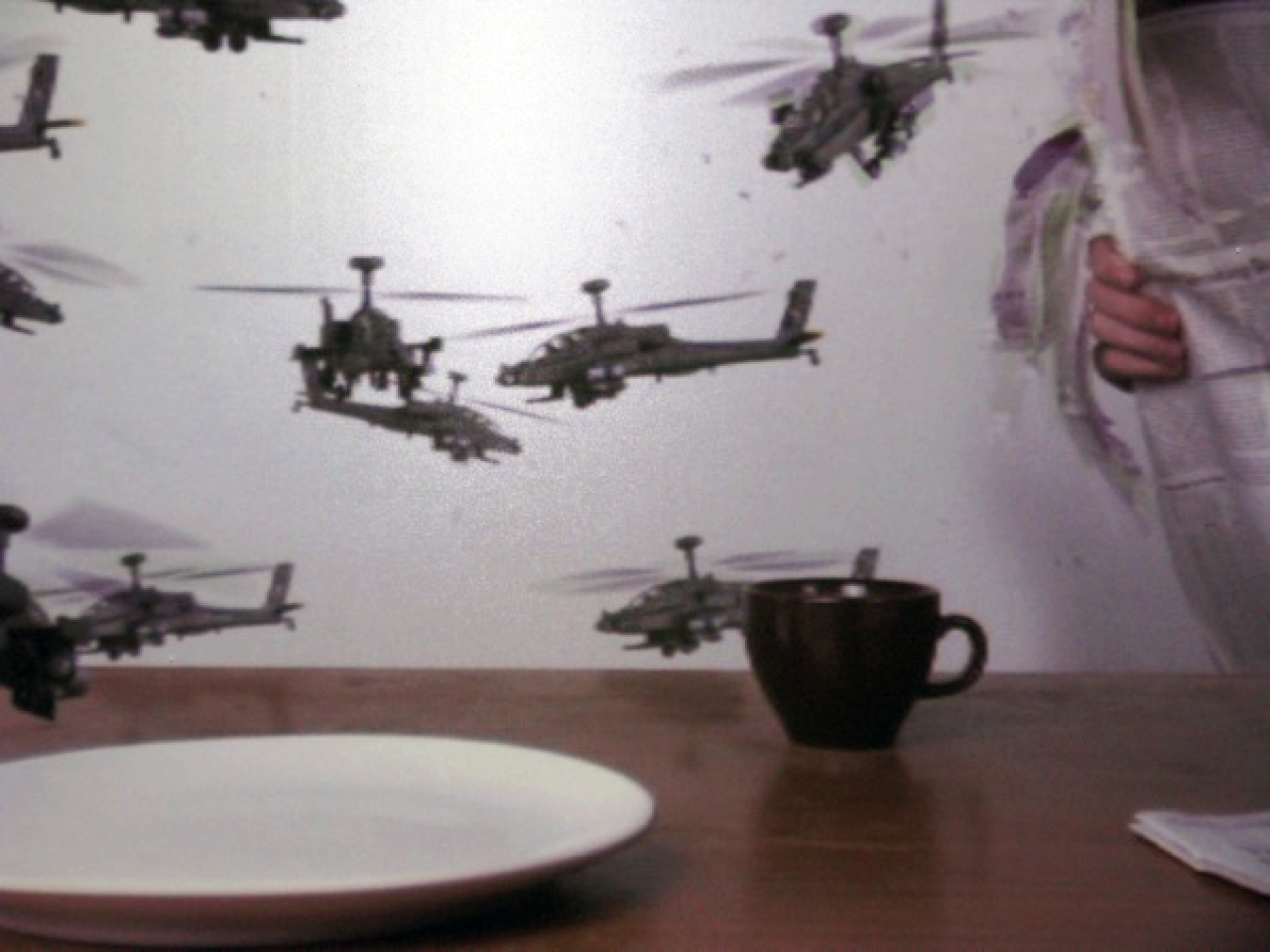 Eveneens een animatie, maar dan met een minder onschuldig thema, is het werk van Douwe Dijkstra “Demontable”. In deze korte film waarin veel gemaakt is met de blue- en greenscreen, wordt een verbeten oorlog letterlijk op de keukentafel gevoerd. Aan de tafel wordt radio geluisterd, koffie ingeschonken en een krant gelezen. Maar dan stijgen er plots helikopters op, mini-helikopters die de krant aan flarden vliegen, gevechtsvliegtuigjes bombarderen een bord aardappelpuree met broccoli, een kop koffie wordt met een soort kanon beschoten. Het gevecht wordt steeds heftiger maar ook absurder en ondanks het zware thema over de dagelijkse oorlog die wij via het nieuws tot ons nemen, is de film luchtig, grappig en zeer speels gemaakt. Af en toe geeft Douwe Dijkstra inzage over het creatieproces en zie je o.a. hoe met bubbelplastic de bomgeluiden gemaakt zijn, of hoe een geweer uit een houten plaat wordt gezaagd. Het contrast tussen het groot- en kleinschalige, werkelijkheid en spel; het maakt dit werk tot een van de hoogtepunten van deze expositie.
