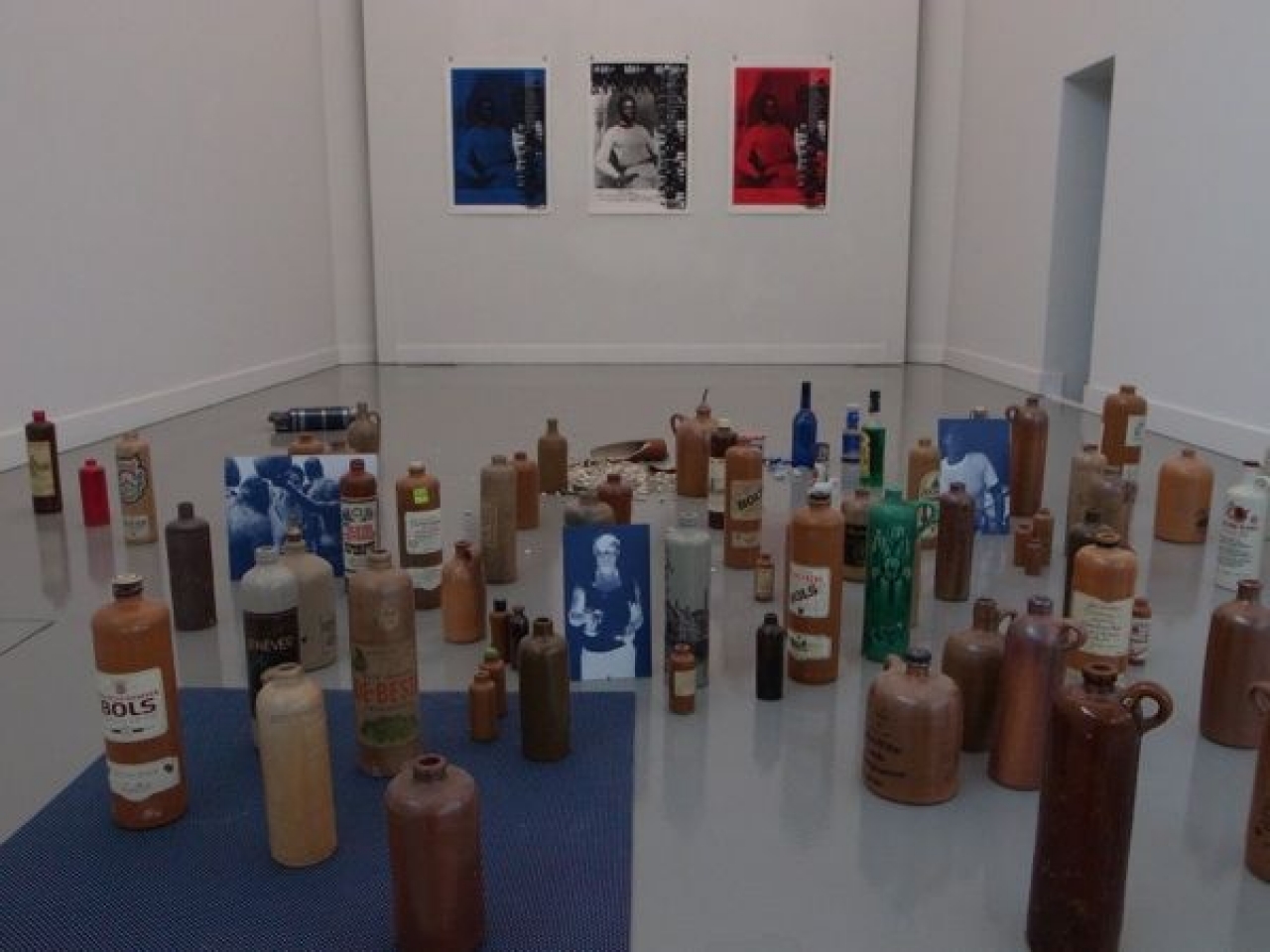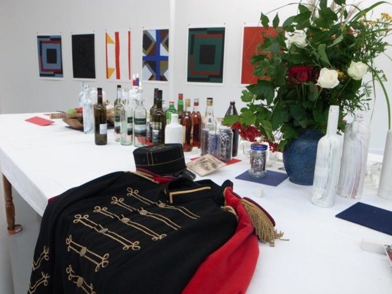 Naast het wapen van de familie Schimmelpennick staan op de tafel verschillende verzamelingen objecten. We zien o.a. naar suikerriet verwijzende objecten (symbool voor de koloniale economie), lege flessen met daarin foto’s en geschreven berichten (zowel verwijzend naar alcohol als product van suikerriet als naar flessenpost), fruitschalen met echt fruit (zoetigheid, verbinding van het leven), een historisch legeruniform (symbool voor strijd en de koloniale macht) en een uniform van de Diepenheimse schutterij (juist als verbroederende vertegenwoordiging van de verdediging van de stad, uitgegroeid tot een folkloristisch festival waar de hele stad zich bij betrokken voelt). De tafel is als een groot altaar dat niet alleen als symbool leesbaar is maar ook door kleur en geur ervaarbaar is.