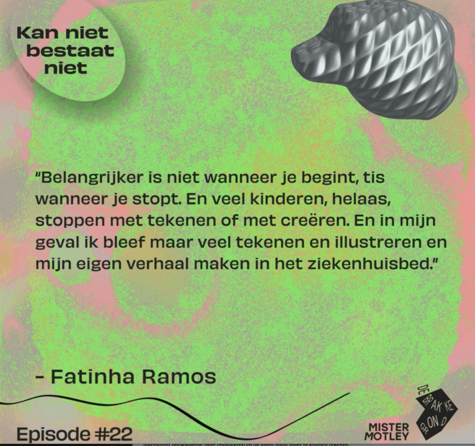 Fatinha Ramos maakt uiteenlopend werk. Illustraties vormen de kern van haar praktijk. Geïnspireerd door haar aandoening vervaardigt ze glazen sculpturen die de kwetsbaarheid van haar botten benadrukken. Een aantal jaar geleden kwam ze in New York ten val, een moment dat impact had op haar lichaam en op haar werk. In deze bijzondere live-aflevering van Kan niet bestaat niet praat Fatinha met Maurits de Bruijn en Lieneke Hulshof over deze omwenteling, hoe ze als kind in een ziekenhuisbed haar tekenkunst ontwikkelde, over revalideren en de angst nooit meer te kunnen tekenen.