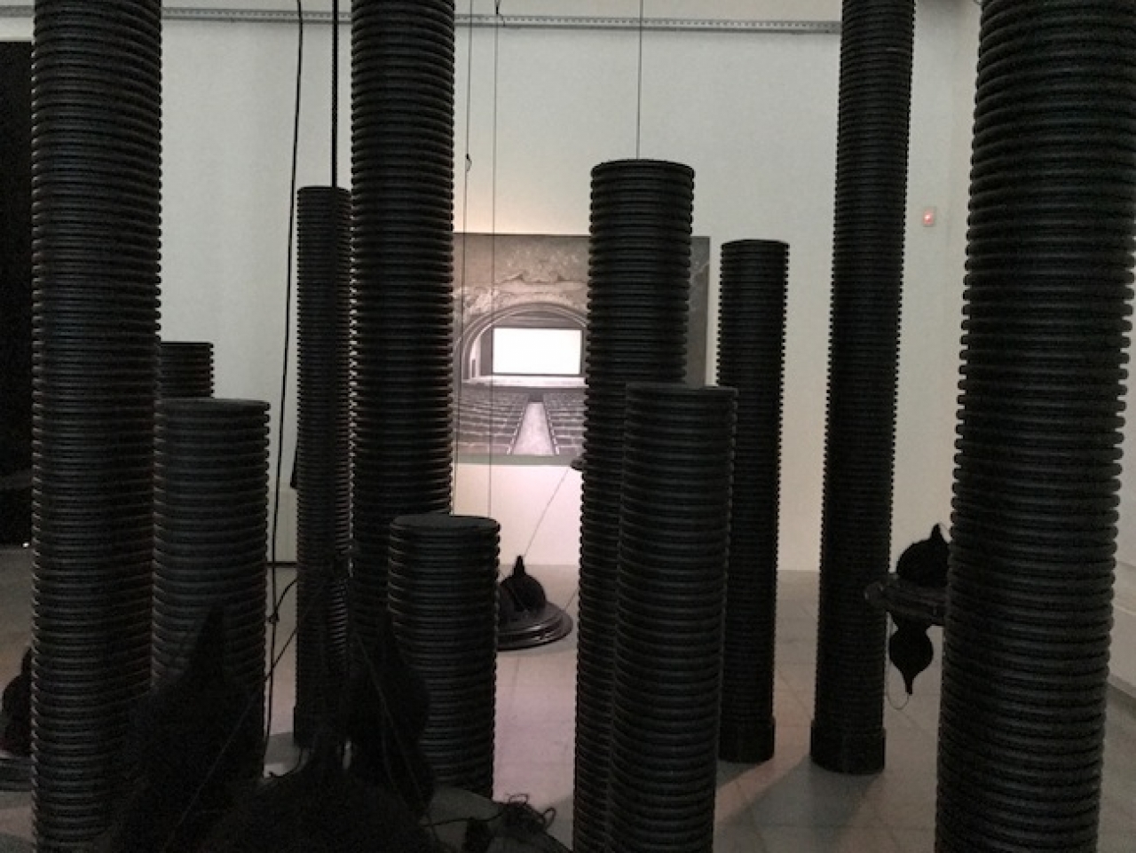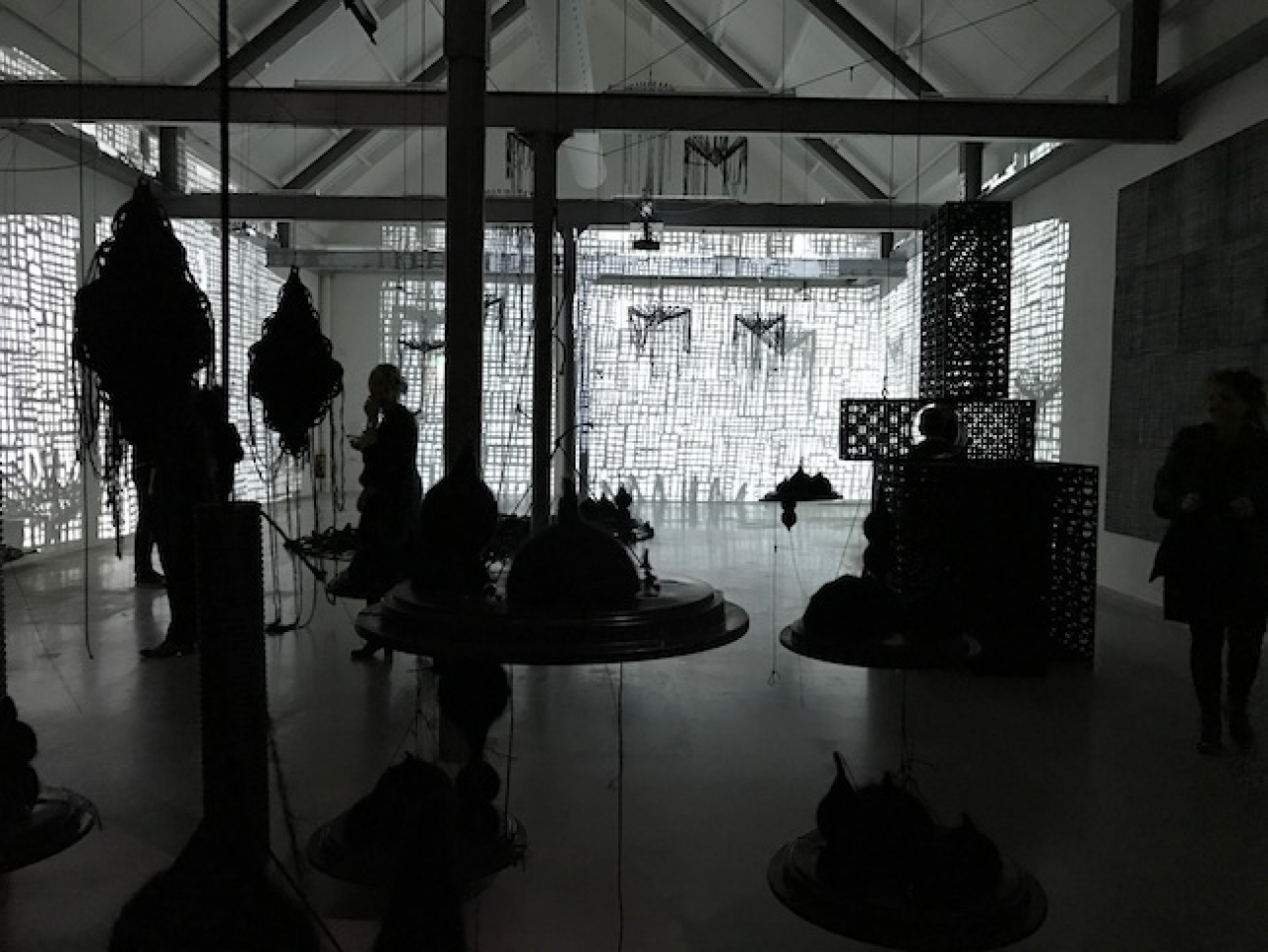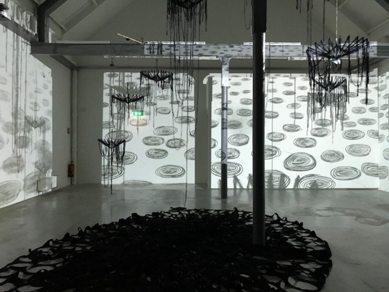 Haar sculpturen zetten de bezoeker in beweging. Dwalend door het labyrint van zwarte objecten, hangend, staand, zwevend, roepend vragend, spugend, eindig je bij een muur, een vlak, bij de tekening van Robbie.