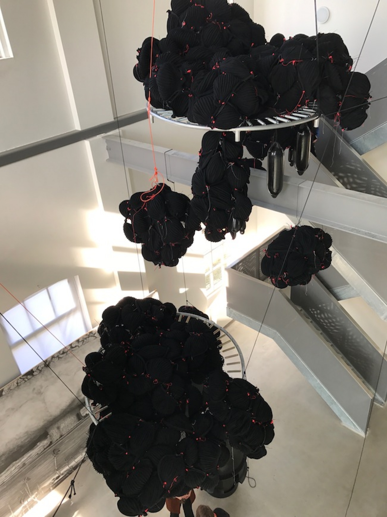 Karin schiet de hoogte, duikt de diepte in , zwevend en duikend. Een eerdere tentoonstelling heette ‘born in a balloon’, Ik las dat tijdens de allereerste ballonvaarten. Aeronauten, vaak niet beseften of ze voorruit gingen of stil in de lucht hingen, hoogte wonnen of aan het afdalen waren. Ze gooiden dan een handvol veren in de lucht , die ofwel omhoog dansten ofwel omlaag.